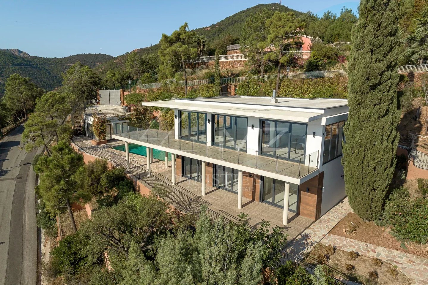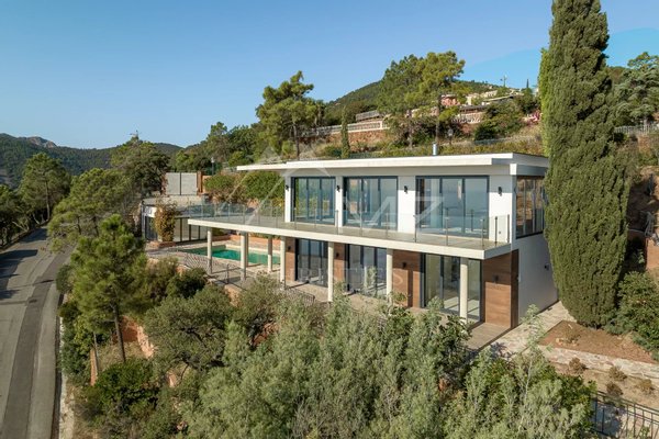 Am Ortsausgang von Théoule in einer geschlossenen Sicherheitsanlage mit Blick auf die Bucht und das Esterel-Gebirge liegt diese moderne, komplett renovierte Villa auf 2 Ebenen mit einer bebauten Fläche von ca. 210 m2 auf einem Grundstück mit Pool,