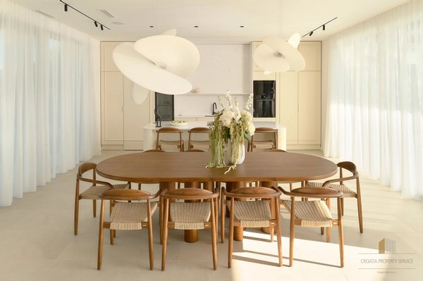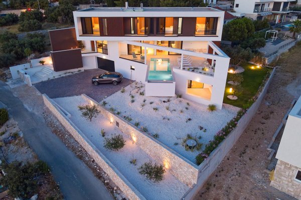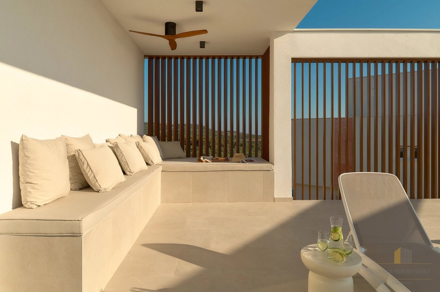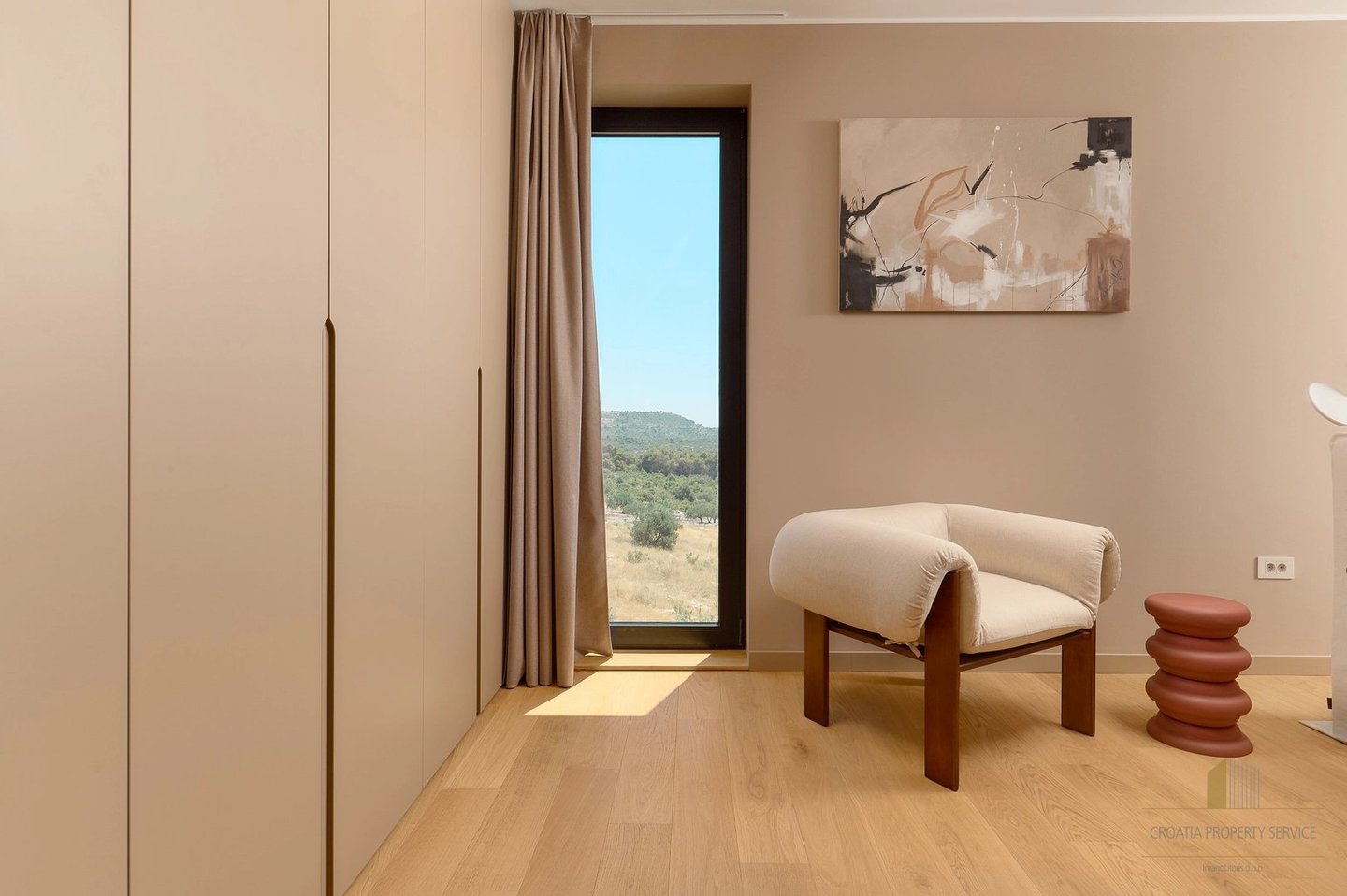 Zum Verkauf steht eine beeindruckende Luxusvilla mit modernem Design, gelegen an einer prestigeträchtigen Lage in der Nähe von Primošten, mit dominantem Panoramablick auf das Meer und den alten Teil von Primošten.