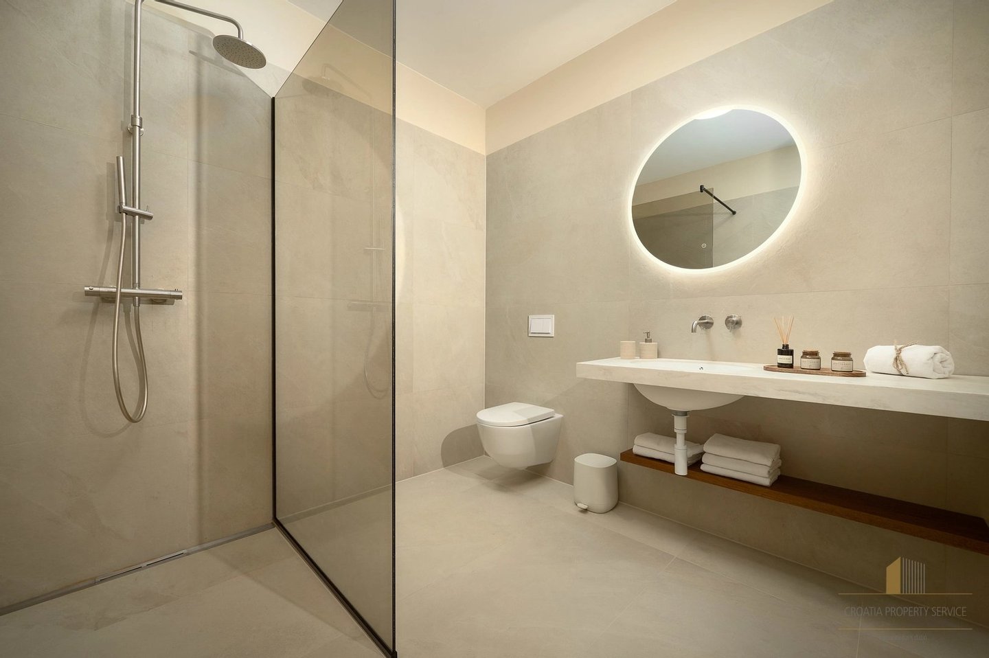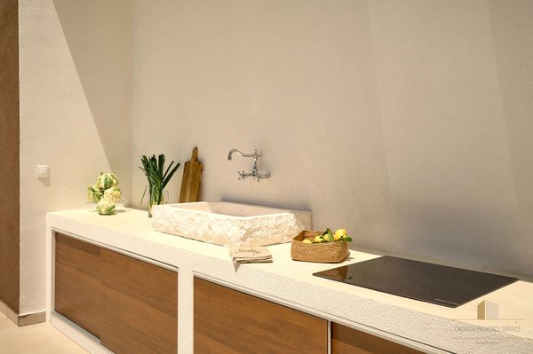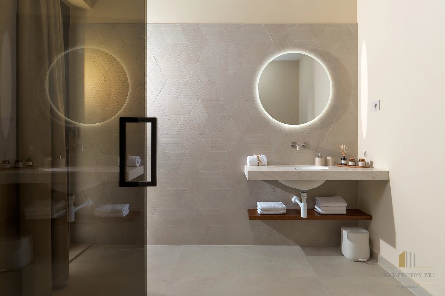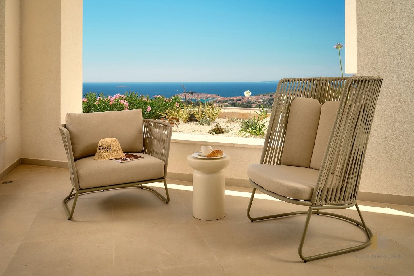 Zum Verkauf steht eine beeindruckende Luxusvilla mit modernem Design, gelegen an einer prestigeträchtigen Lage in der Nähe von Primošten, mit dominantem Panoramablick auf das Meer und den alten Teil von Primošten.