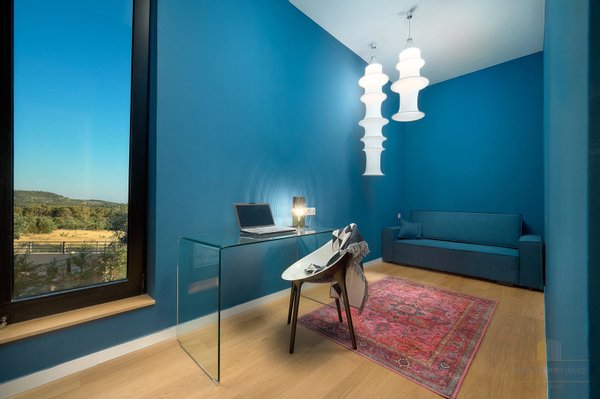 Der erste Stock bietet ein geräumiges Wohnzimmer mit moderner Küche, ein Arbeitszimmer, das auch als weiteres Schlafzimmer genutzt werden kann, eine Gästetoilette sowie zwei prunkvolle Terrassen – eine mit Außenküche auf der Ostseite und die andere mit einem herrlichen Infinity-Pool auf der Westseite.