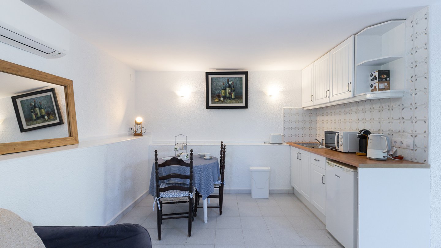 Im Untergeschoss, auf Höhe des Pools, befindet sich ein separates Studio mit einem Schlafzimmer, das zu einem kleinen Wohnbereich und der Küche hin offen ist, sowie ein Badezimmer.
