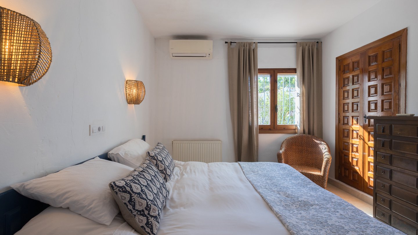 Das Erdgeschoss bietet ein charmantes Wohn-Esszimmer mit Blick auf den Montgó, einen Kaminofen, eine voll ausgestattete offene Küche, eine nach Westen ausgerichtete, verglaste Terrasse (Naya) ? ideal, um wunderschöne Sonnenuntergänge zu genießen ?, drei Doppelschlafzimmer (das Hauptschlafzimmer mit eigenem Bad) und ein Badezimmer. Ebenfalls auf dieser Etage befindet sich eine offene Terrasse mit Grillplatz.