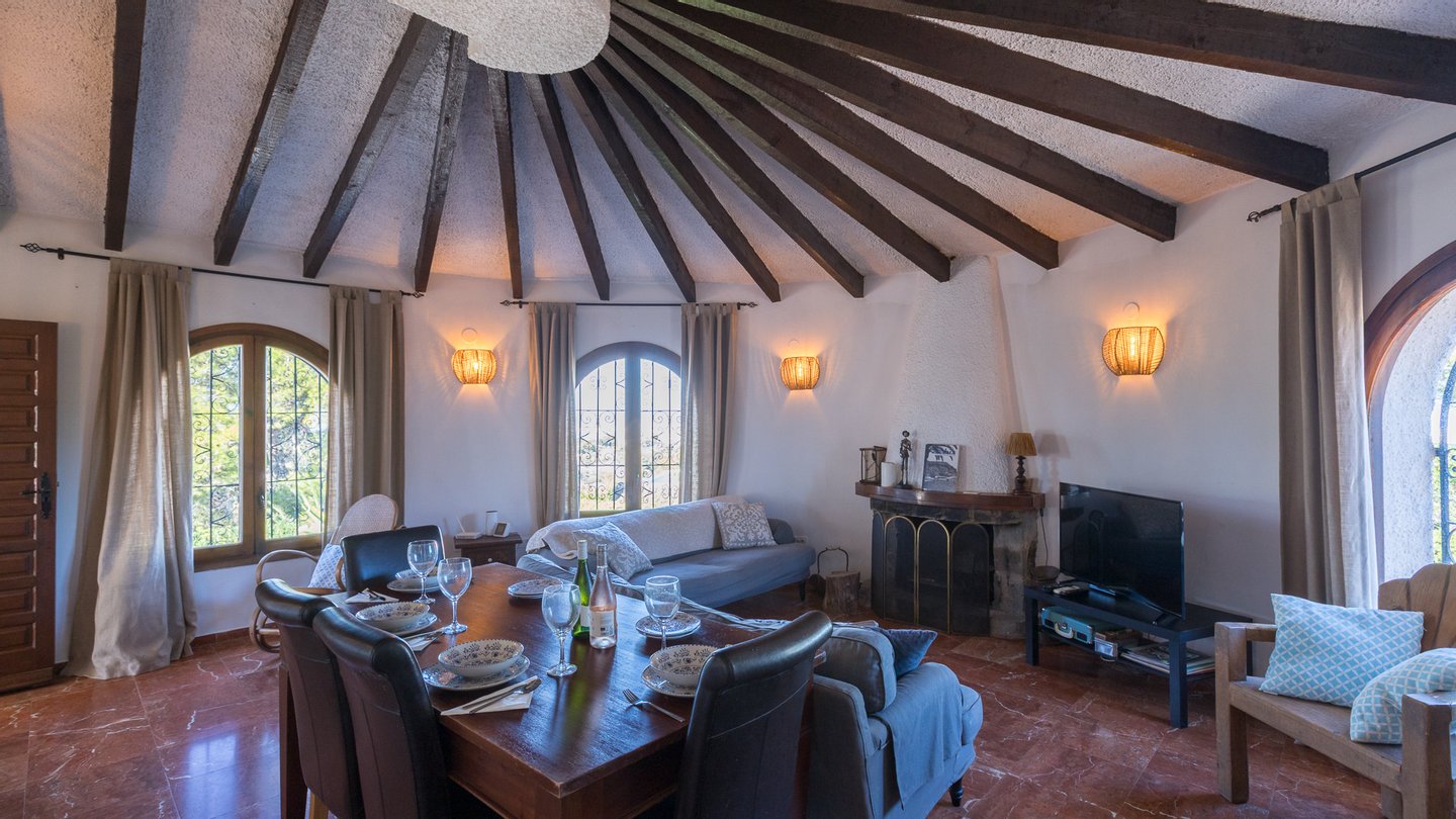 Das Erdgeschoss bietet ein charmantes Wohn-Esszimmer mit Blick auf den Montgó, einen Kaminofen, eine voll ...mehr lesen