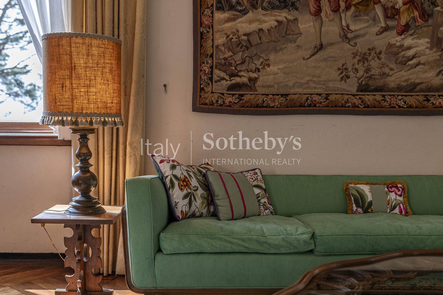 Der quadratische Grundriss der Villa und die Anordnung der Räume sind darauf ausgelegt, das natürliche Licht zu maximieren, mit großen Fenstern, die atemberaubende Ausblicke auf den Park und den See bieten. Die Villa erstreckt sich über zwei Ebenen. Das Piano Nobile, mit einer Fläche von 1.000 m², beherbergt großzügige Salons, eine Panoramaterrasse, ein Esszimmer, ein Arbeitszimmer und fünf Schlafzimmer, jeweils mit eigenem Badezimmer, ausgestattet mit edlen Marmoren. Jeder Raum ist mit maßgefertigten Möbeln von Buzzi ausgestattet, die den Räumen Einzigartigkeit und Raffinesse verleihen. Das Dienstpersonal-Geschoss, etwa 800 m² groß, umfasst ursprünglich für das Personal vorgesehene Bereiche, bietet heute jedoch vielfältige Möglichkeiten zur individuellen Gestaltung.