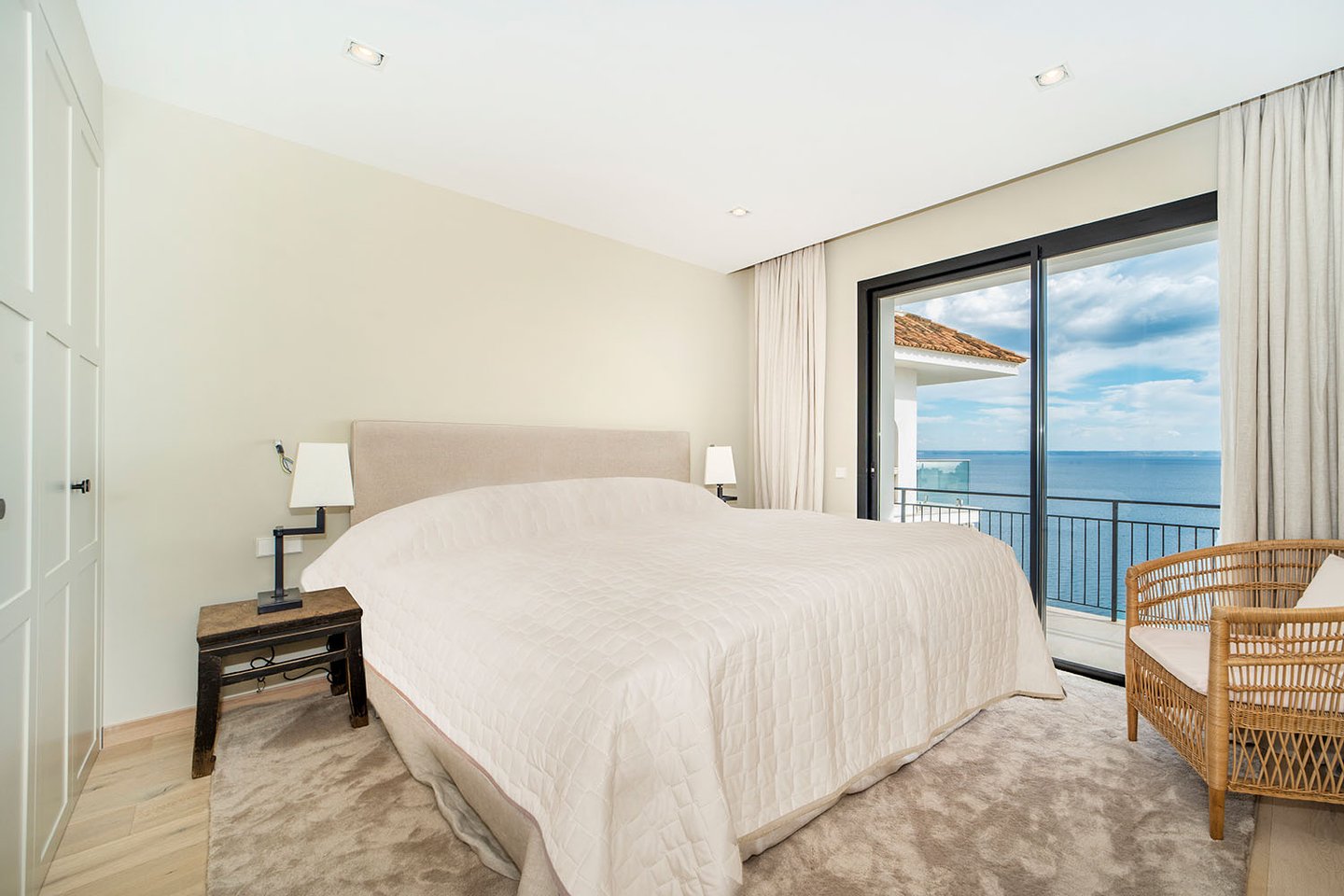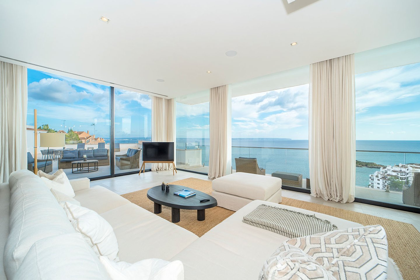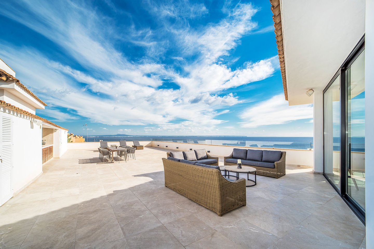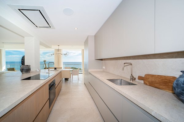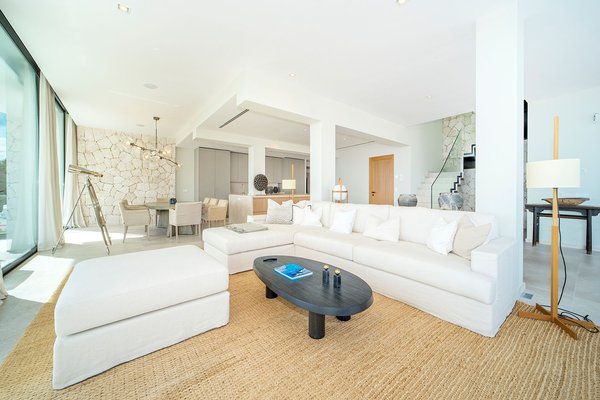 Die Immobilie bietet eine großzügige Nutzfläche von ca. 292 m², die sich auf vier elegante Schlafzimmer und vier moderne Bäder verteilt. Der weitläufige Wohn- und Essbereich mit offener Designküche und Kochinsel überzeugt durch seine Helligkeit und den fließenden Übergang zu den umlaufenden Terrassen. Auf der sehr großzügigen, an den Wohnbereich angrenzenden Meerblickterrasse befinden sich zudem eine Lounge-Area und eine voll ausgestattete Sommerküche. Ein separater Hauswirtschaftsraum sorgt für zusätzlichen Komfort.