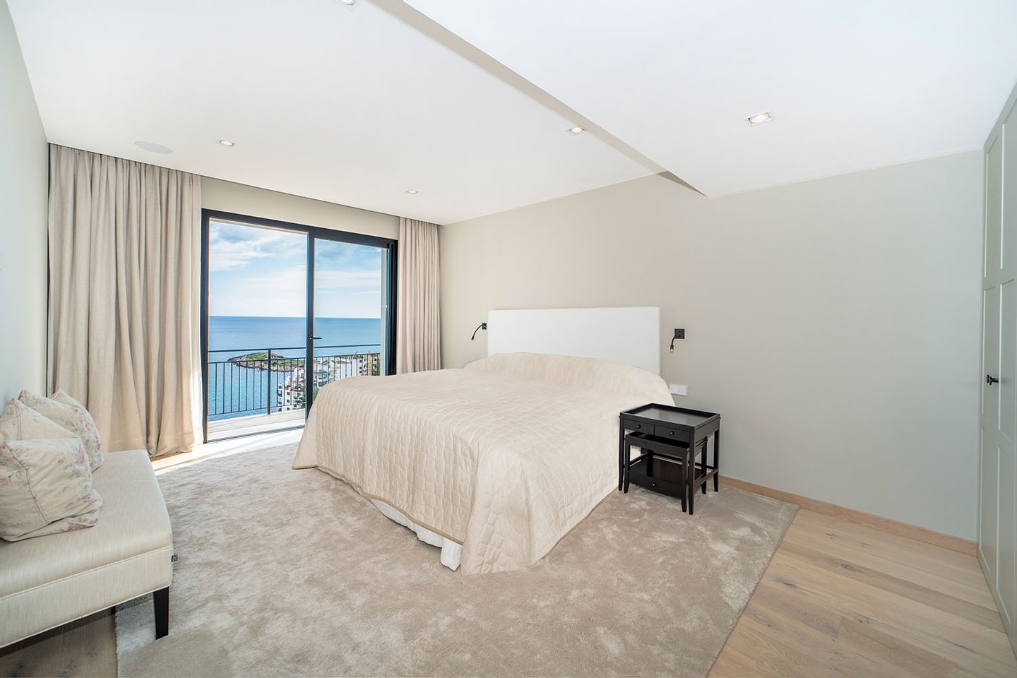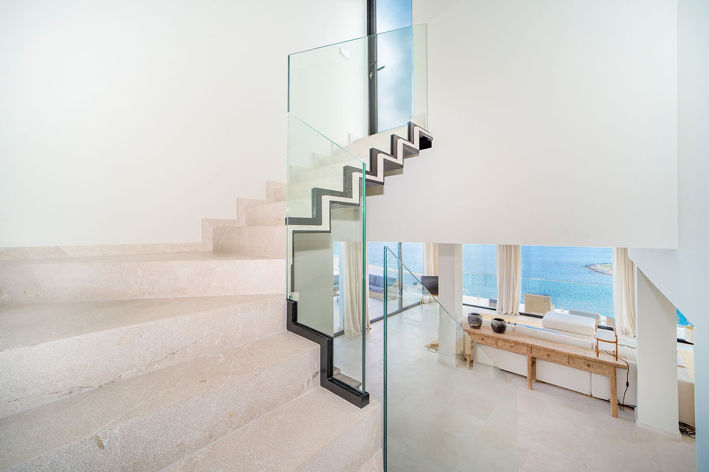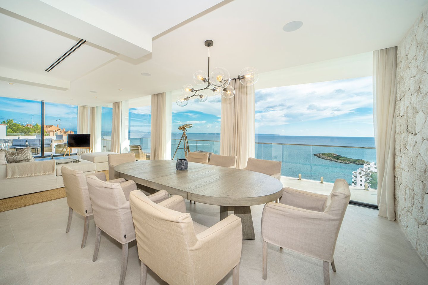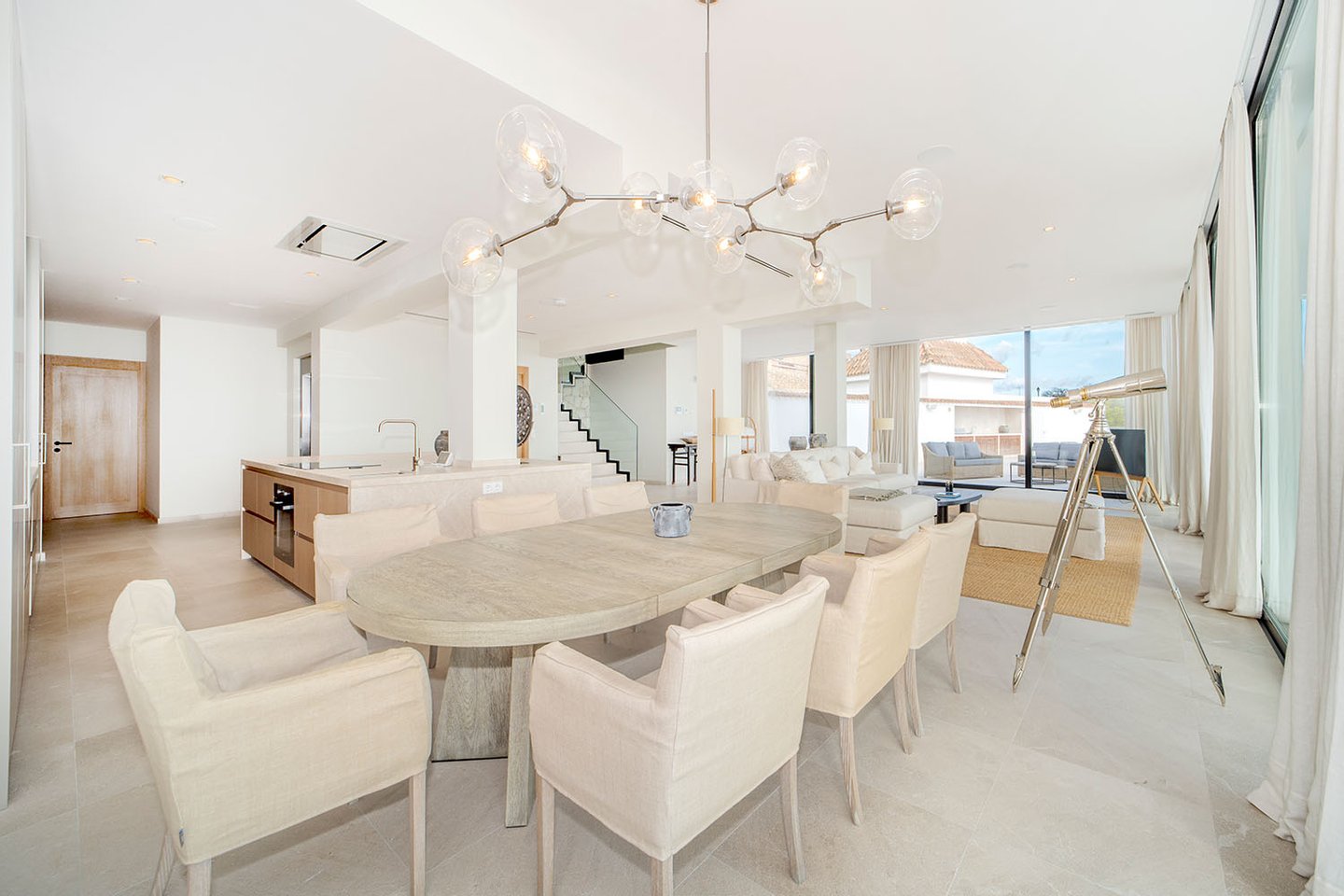 Die Immobilie bietet eine großzügige Nutzfläche von ca. 292 m², die sich auf vier elegante Schlafzimmer und vier moderne Bäder verteilt. Der weitläufige Wohn- und Essbereich mit offener Designküche und Kochinsel überzeugt durch seine Helligkeit und den fließenden Übergang zu den umlaufenden Terrassen. Auf der sehr großzügigen, an den Wohnbereich angrenzenden Meerblickterrasse befinden sich zudem eine Lounge-Area und eine voll ausgestattete Sommerküche. Ein separater Hauswirtschaftsraum sorgt für zusätzlichen Komfort.
