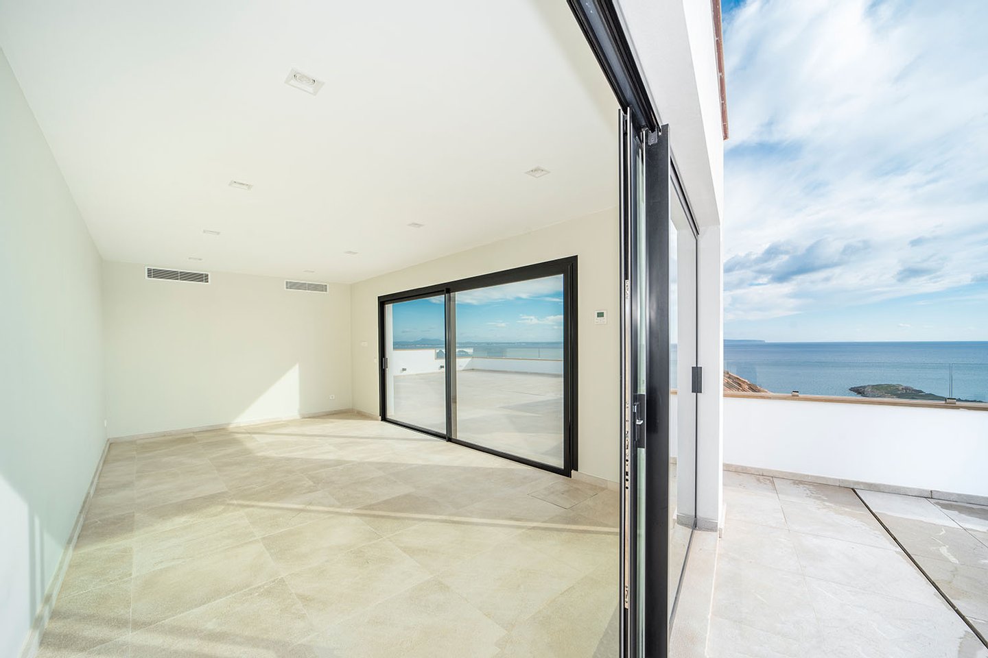 Zu den besonderen Ausstattungsmerkmalen zählen Fußbodenheizung, Klimaanlage sowie ein Aufzug, der direkten Zugang zur Wohnung ermöglicht. Ein absolutes Highlight ist die rund 281 m² große private Dachterrasse, die mit spektakulärem Meer- und Panoramablick beeindruckt. Zwei Garagenstellplätze im Nachbargebäude ergänzen das attraktive Angebot.