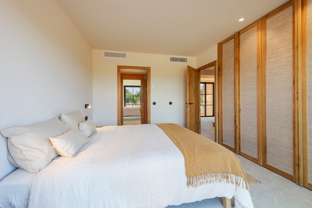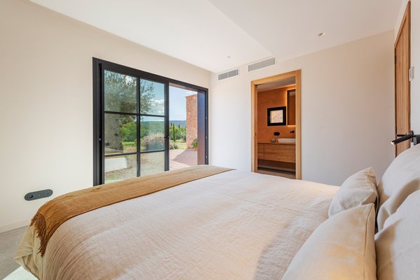 Im Obergeschoss bietet die Master-Suite mit eigenem Bad und Balkon einen ruhigen Rückzugsort mit weitreichendem Blick auf die umliegende Landschaft.