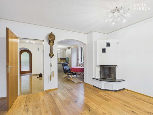 Wohnzimmer mit Kamin und Zugang zur Terrasse