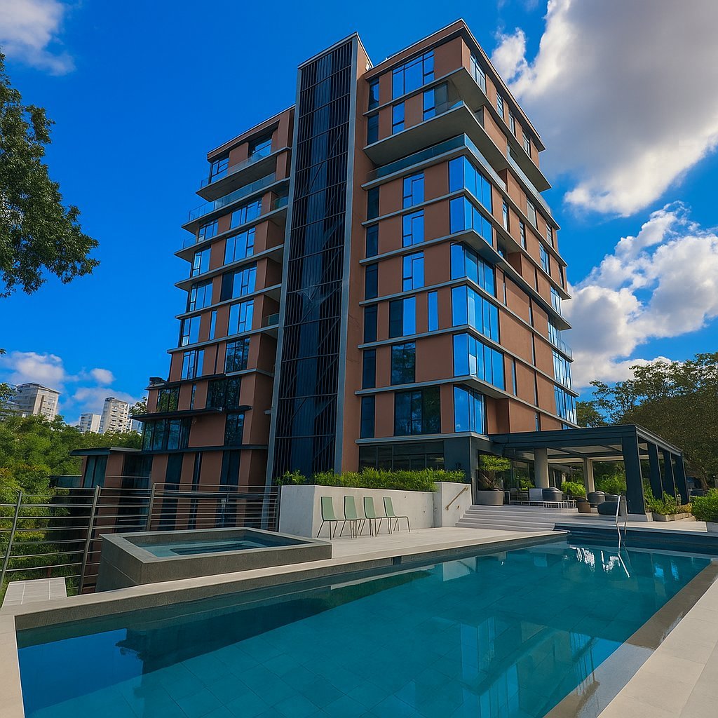 Willkommen bei Sky Residence 402 – einem ultra-luxuriösen, vollgeschossigen Haus im 10. Stock des ikonischen 402-Turms an der Avenida Escazú, Costa Ricas exklusivster gemischt genutzter Siedlung.