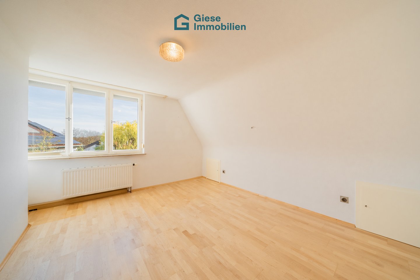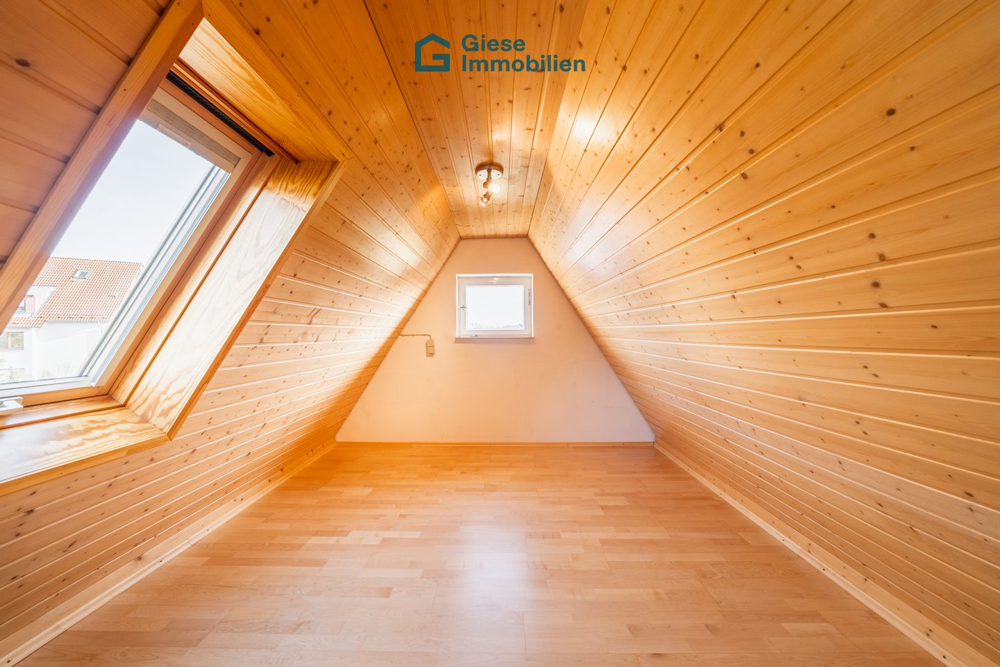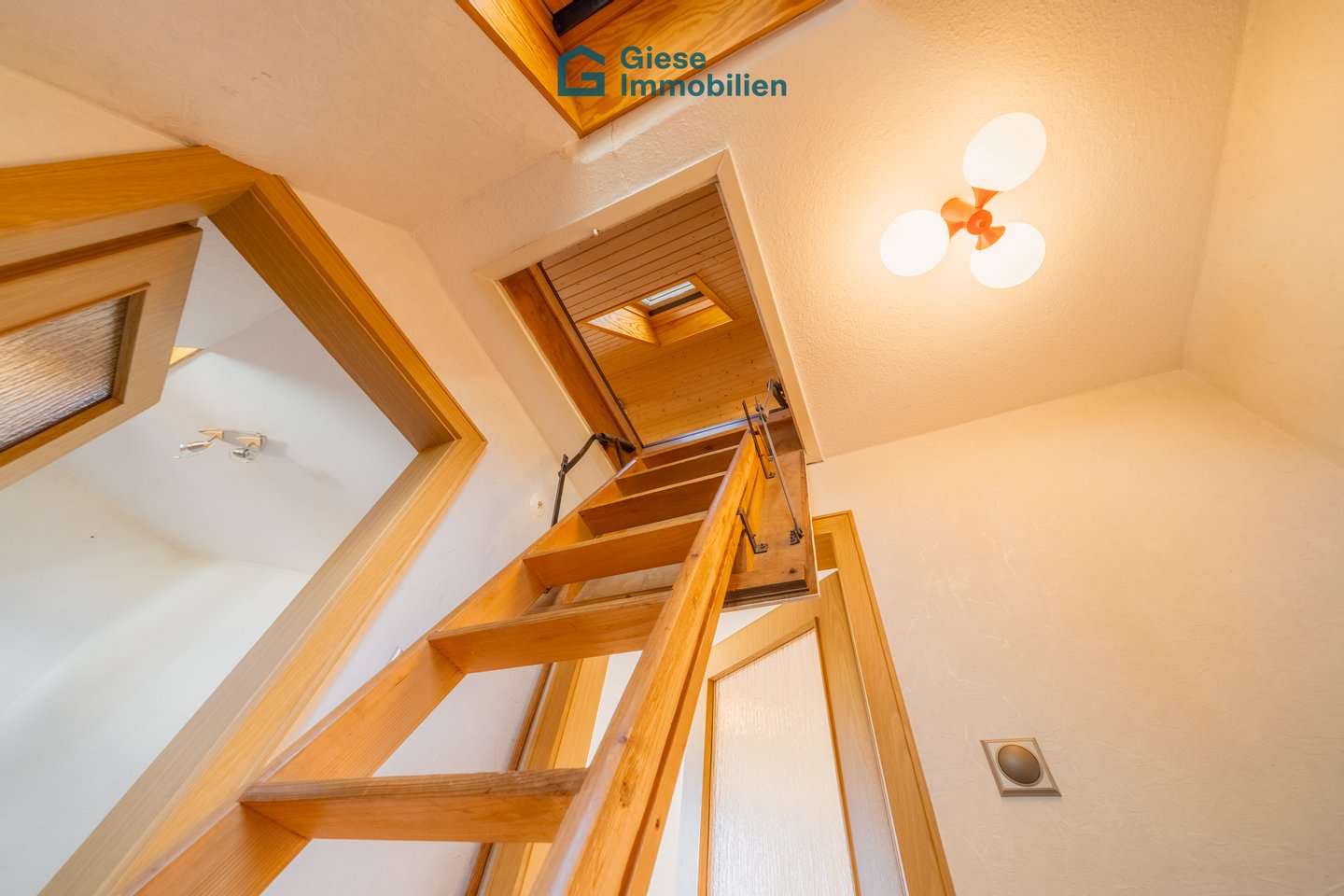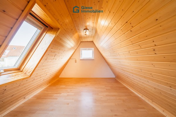 Im Dachgeschoss liegen das Schlafzimmer und ein Ankleidebereich, der auch als kleines Büro oder Rückzugsort genutzt werden kann. Der darüberliegende Dachboden ist bereits ausgebaut und bietet zusätzliches Potenzial: Die bestehende Luke kann zu einem dauerhaften Treppenaufstieg umgestaltet werden, sodass hier ein weiteres vollwertiges Zimmer entstehen kann.