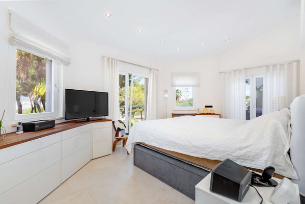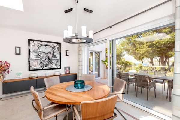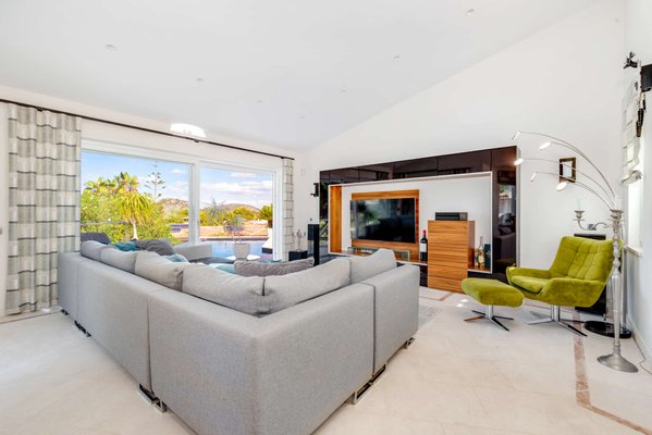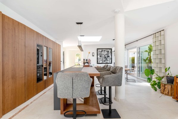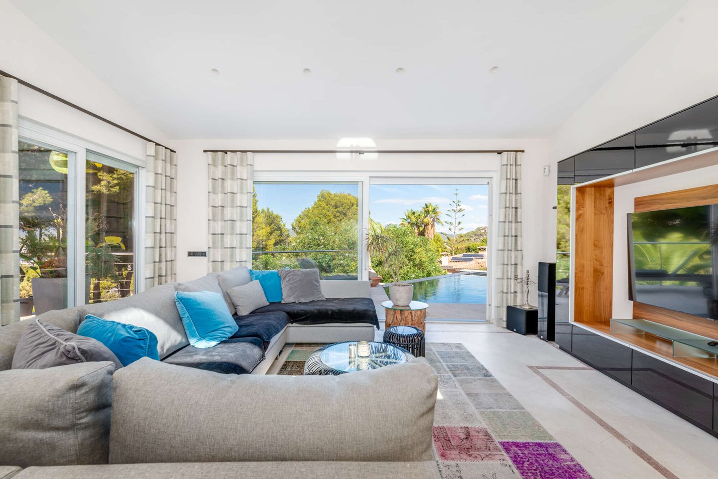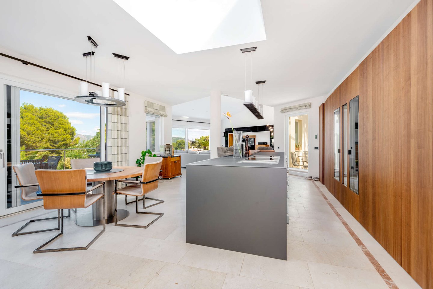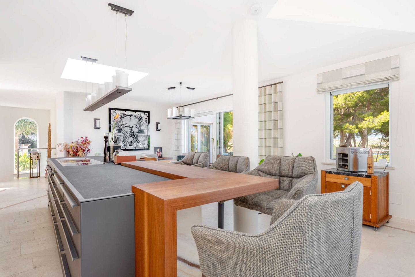 Klare Linien, große Glasfronten und natürliche Materialien schaffen ein Ambiente, das offen, hell und dennoch warm wirkt. Der großzügige Wohn- und Essbereich mit seinen raumhohen Schiebetüren öffnet sich zur weitläufigen Terrasse mit Infinity-Pool, von der aus sich der Blick über die grüne Umgebung bis hin zum Meer erstreckt. Jeder Sonnenuntergang wird hier zum privaten Schauspiel.