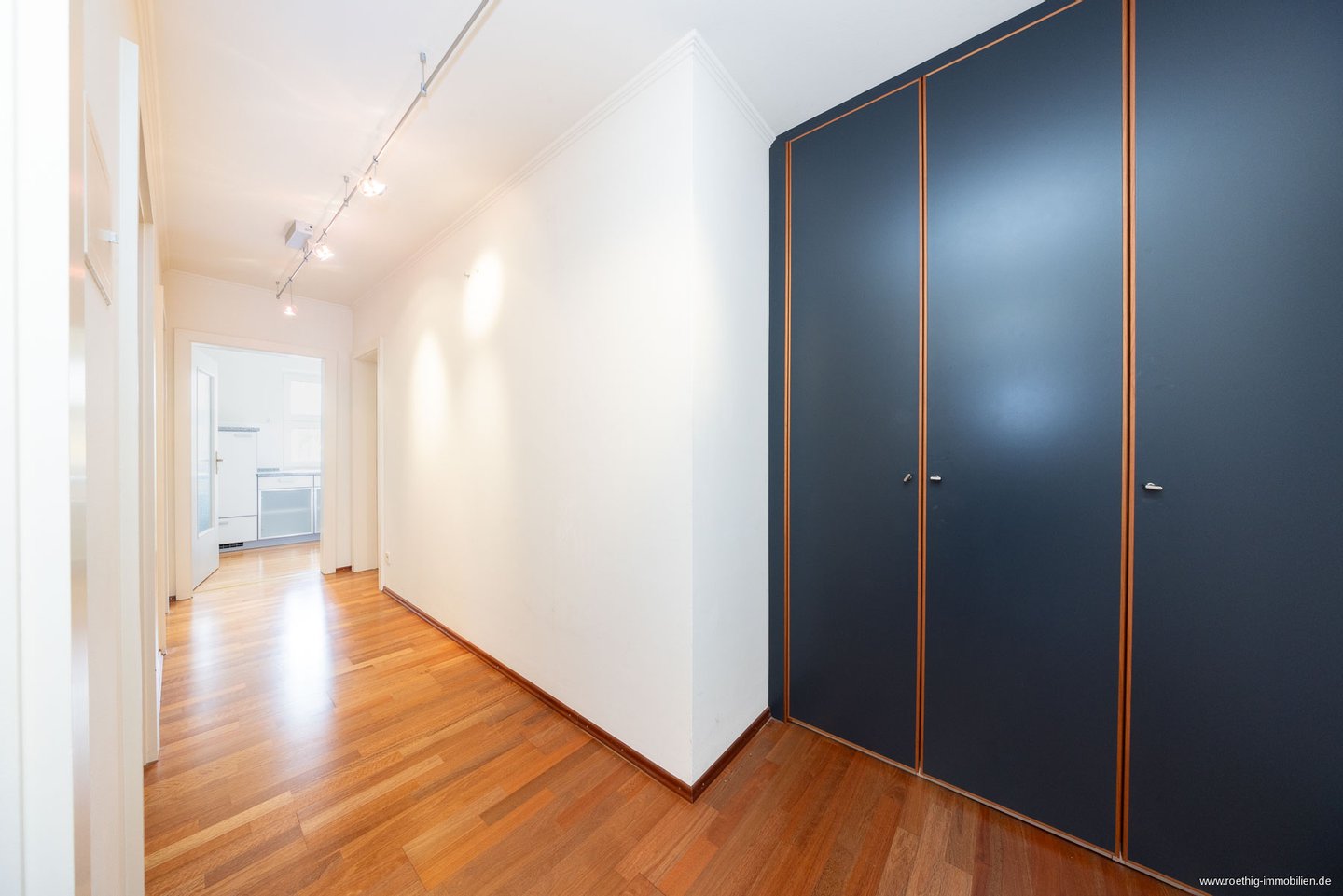 Nach dem Betreten dieses Schmuckstücks empfängt Sie ein großzügiger Eingangsbereich mit einer breiten, praktischen Nische, die derzeit durch einen maßgefertigten, massiven Holzeinbauschrank als komfortable Ankleide genutzt wird.