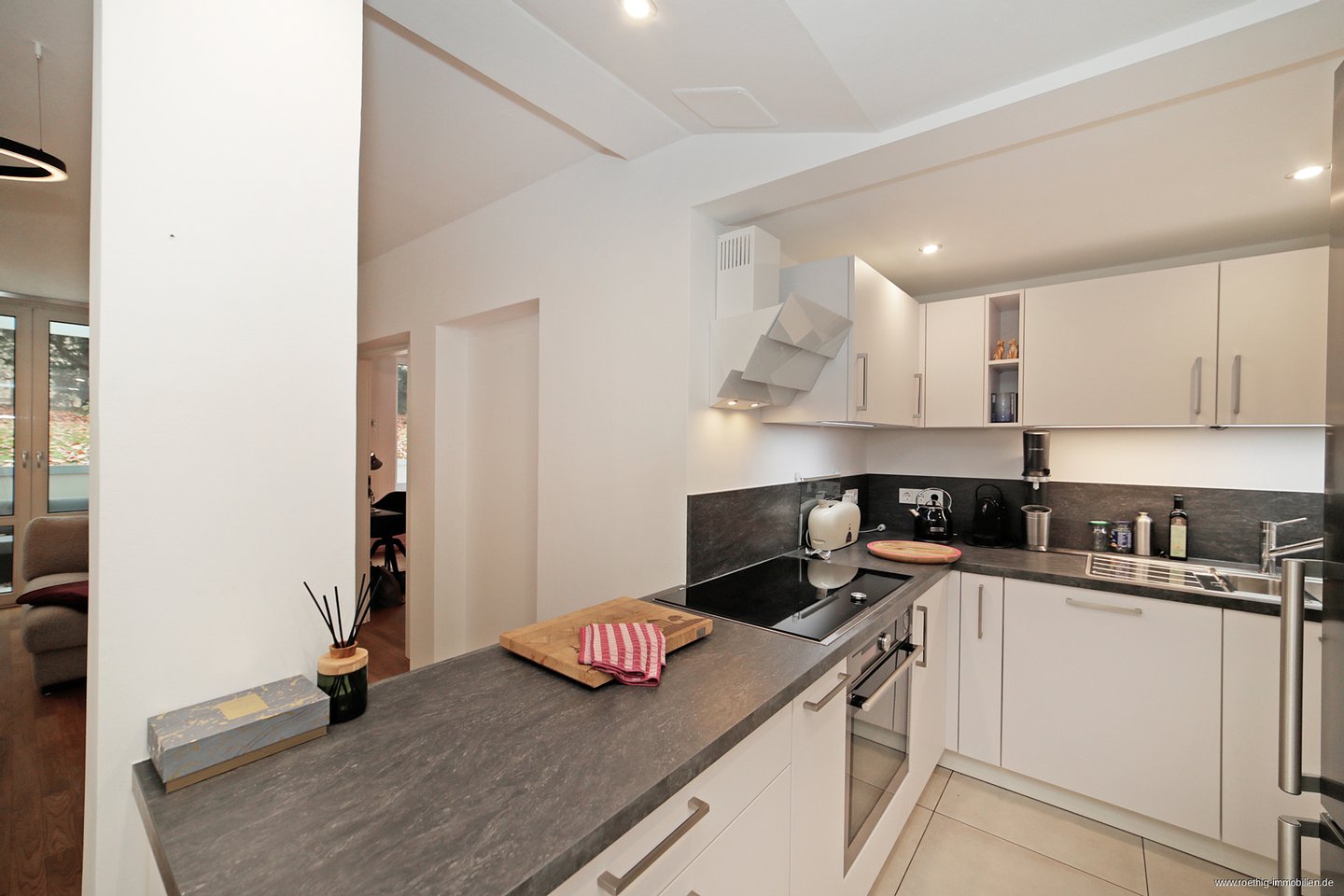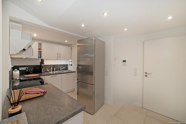Rechter Hand ist die offene Küche angesiedelt. Sie ist mit einer neuwertigen Einbauküche mit allen technischen Geräten versehen und bietet ausreichend Stauraum.