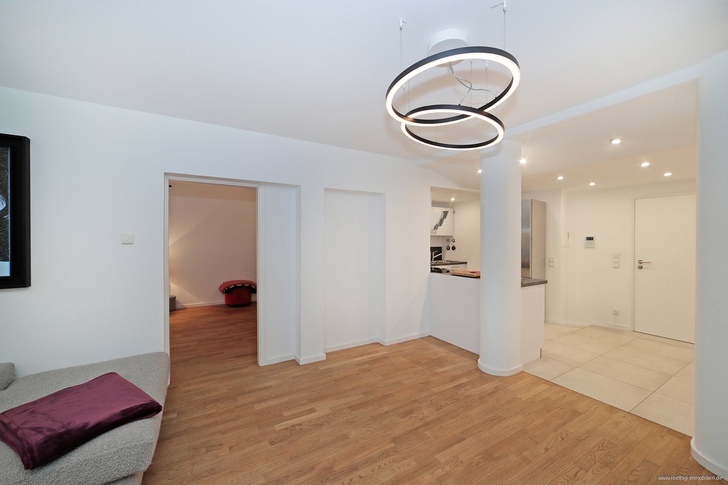 Nach Betreten der Wohnung stehen im zentralen Flur, welcher alle Räumlichkeiten geschickt miteinander verbindet und direkt in den hellen Wohnbereich übergeht. Der Boden im Eingangsbereich ist mit pflegeleichten Fliesen versehen und die Fußbodenheizung sorgt für wohlige Wärme.