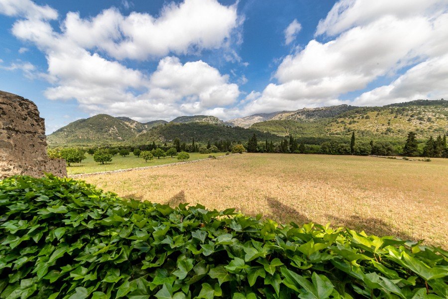 Die Finca liegt in einem schönen Tal, und das Panorama ist im Norden das Tramuntana-Gebirge, das aus Steineichen und Kiefernwäldern besteht, und im Süden das Anwesen selbst, mit einem ausgedehnten Gebiet von Kiefern- und Steineichenwäldern, mit Höhen zwischen 60 und 320 m über dem Meeresspiegel. Außerdem gibt es auf dem Gelände zahlreiche unbefestigte Straßen, die mit einem Geländewagen befahren werden können, da sie von der Forstverwaltung gepflegt werden. Der untere Teil des Anwesens ist dem Getreideanbau gewidmet.