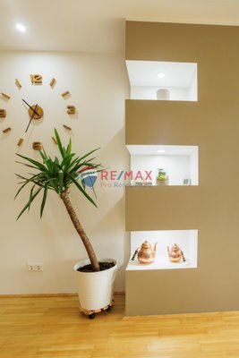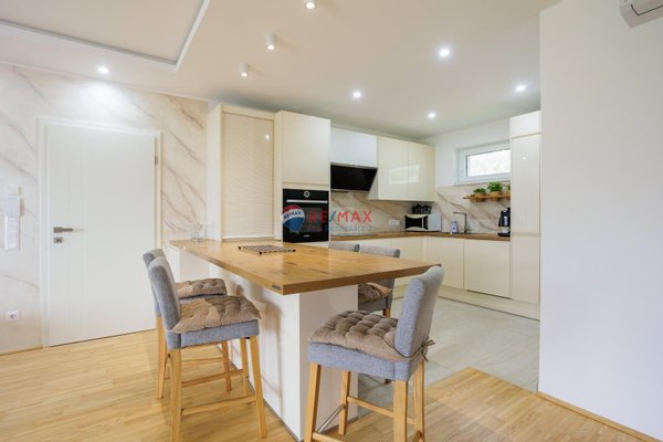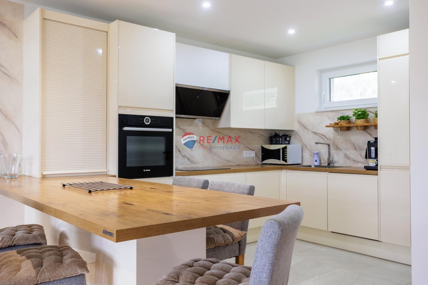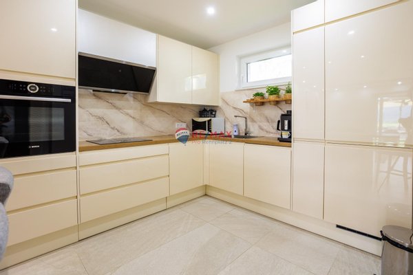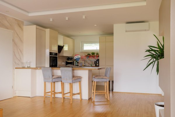 Ein kleiner Zwischenflur verbindet diese Räume mit der modernen Küche und dem hellen Wohnzimmer. In der Küche sorgt ein praktischer Vorratsraum für reichlich Stauraum mit Waschmaschine und Trockner . Auf der großen Esstheke finden alle Familienmitglieder und Gäste Platz, um gemeinsame Mahlzeiten zu genießen. Vom Wohnzimmer aus ist die überdachte Terrasse zugänglich, die den Wohnraum nach draußen erweitert.
