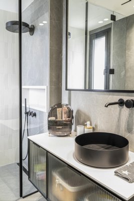 Das Obergeschoss beherbergt eine majestätische Master-Suite, die als privates Refugium konzipiert ist, mit einem eleganten Ankleidezimmer und einem Balkon mit unverbautem Meerblick. Auf dieser Etage befinden sich zwei weitere großzügige Schlafzimmer und zwei Vollbäder, die mit charakteristischen Oberflächen wie Devon & Devon ausgestattet sind und den exklusiven Charakter der Räume unterstreichen.