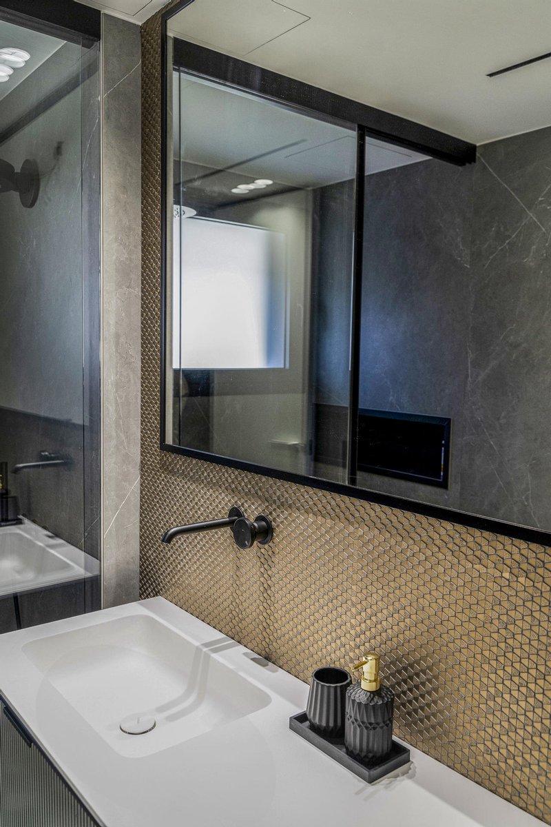 Die Küche, offen zum Sozialraum, aber diskret integriert, ist ein Juwel der Innenarchitektur. Ausgestattet mit Geräten führender Marken wie Poliform, Rimadesio, Gessi und Miele verkörpert sie die perfekte Verschmelzung von avantgardistischer Ästhetik und höchster Funktionalität.