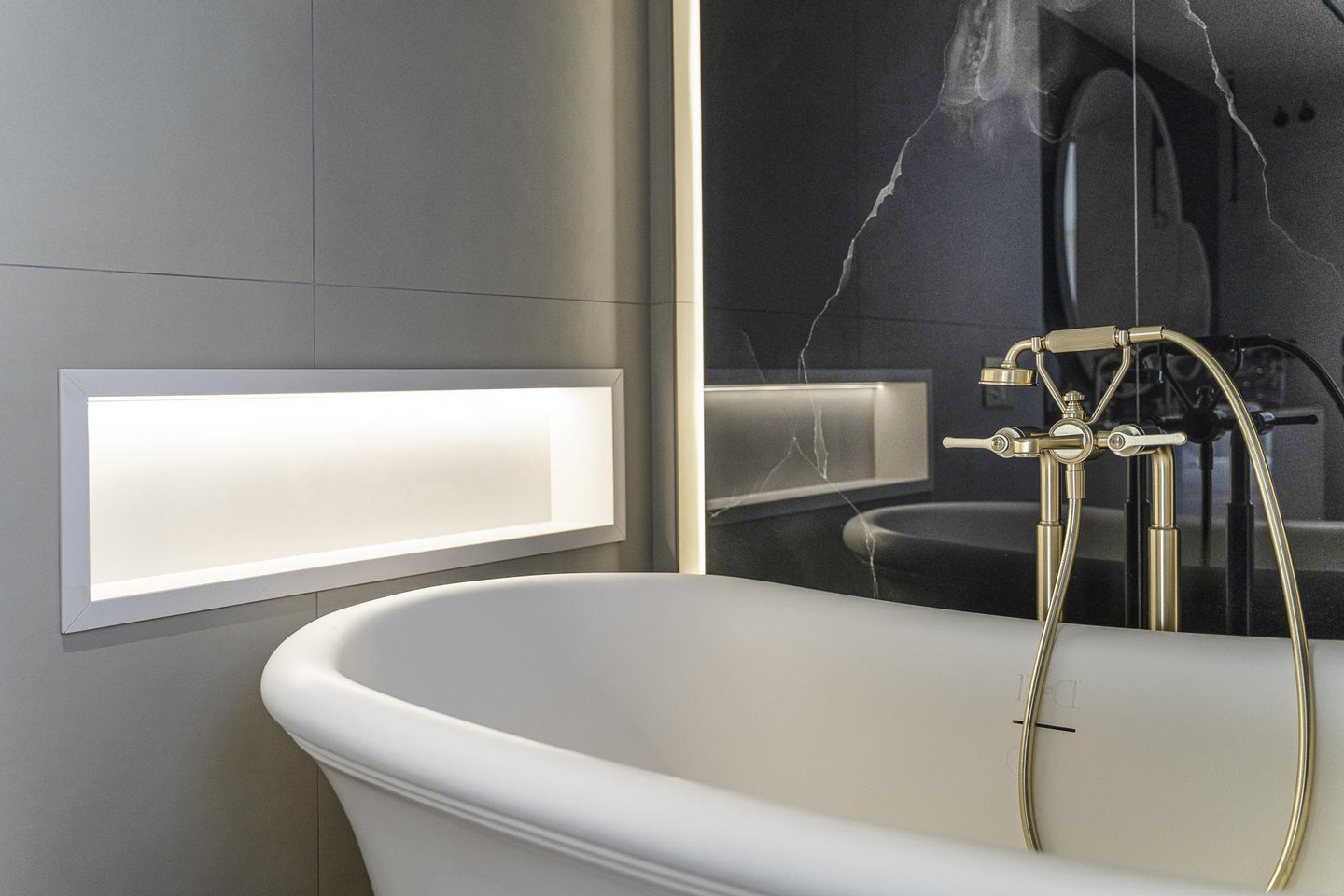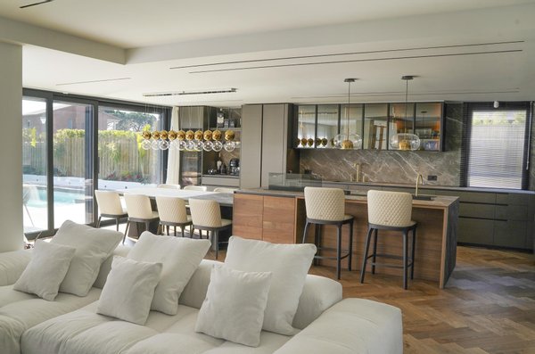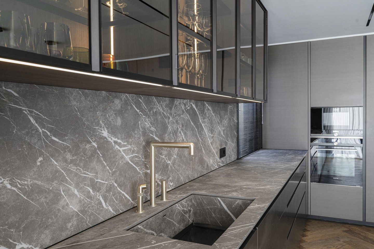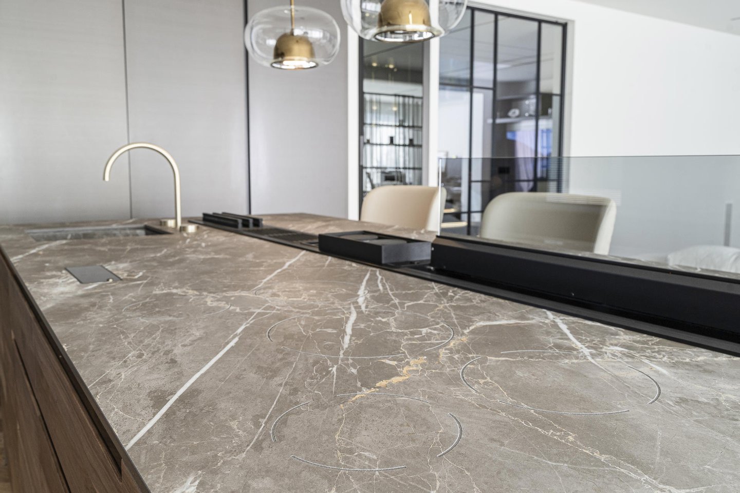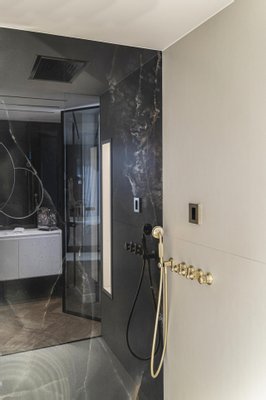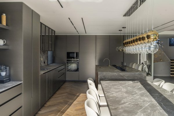 Die Küche, offen zum Sozialraum, aber diskret integriert, ist ein Juwel der Innenarchitektur. Ausgestattet mit Geräten führender Marken wie Poliform, Rimadesio, Gessi und Miele verkörpert sie die perfekte Verschmelzung von avantgardistischer Ästhetik und höchster Funktionalität.
