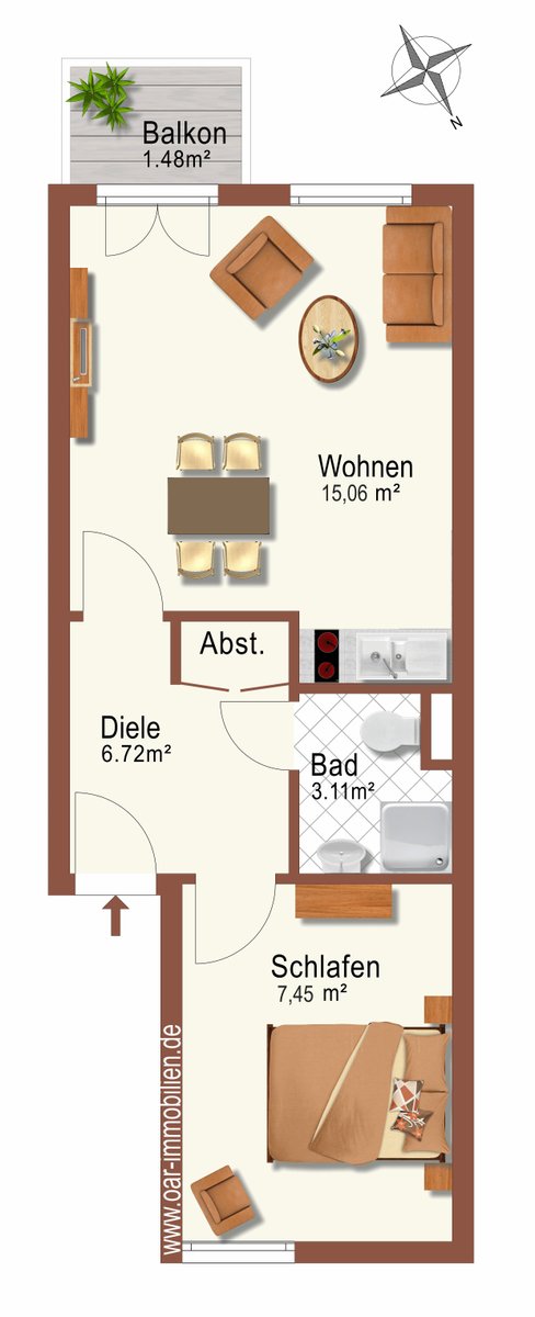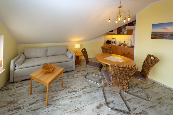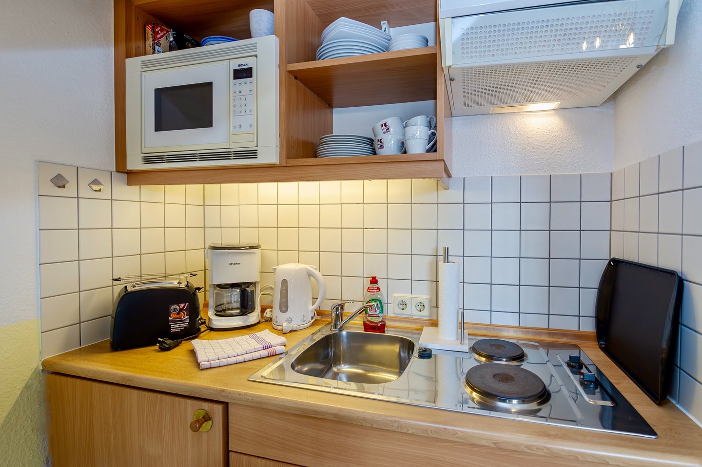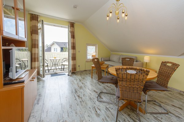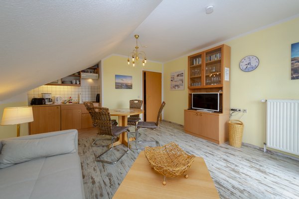 Das angebotene 2-Raum-Appartement im zweiten Obergeschoss überzeugt durch seine Südwest-Ausrichtung und den überdachten Balkon, der zum Entspannen in der Sonne einlädt. Auf einer Wohnfläche von ca. 35,28 m² präsentiert sich die Wohnung mit einem funktional und zugleich gemütlich gestalteten Grundriss. Der offene Wohn- und Essbereich mit charmanten Dachschrägen vermittelt eine angenehme Wohnatmosphäre und ist mit einer komplett ausgestatteten Küchenzeile (Kühlschrank mit Gefrierfach, Mikrowelle, 2-Platten-Herd, Kücheninventar) versehen. Ein Esstisch für vier Personen, ein Schlafsofa, Flachbild-TV und Mini-Stereoanlage komplettieren die Einrichtung. Das Schlafzimmer bietet Platz für ein Doppelbett nebst Kleiderschrank und sorgt mit seiner ruhigen Lage für erholsamen Schlaf. Das hell geflieste Duschbad mit wirkt freundlich und gepflegt. Die Wohnung wird voll möbliert übergeben – ein sofortiger Bezug oder eine direkte Vermietung ist somit problemlos möglich. Die Böden sind teils gefliest, teils mit modernem Belag in heller Landhausdielenoptik ausgestattet. Ein PKW-Stellplatz sowie ein eigener Kellerraum sind im Kaufpreis inbegriffen. Darüber hinaus stehen ein Fahrradkeller, Münzwaschmaschine, und -trockner zur gemeinschaftlichen Nutzung und ein Spielplatz zur Verfügung. Ob als renditestarke Ferienimmobilie oder zur zeitweisen Eigennutzung – dieses Appartement überzeugt durch seine attraktive Lage, die gepflegte Anlage und ein angenehmes Wohnambiente.