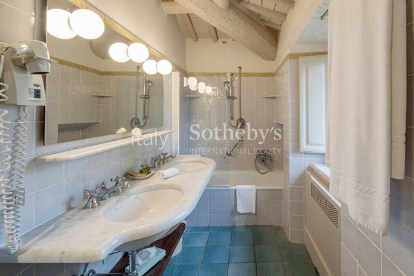 The interiors retain the rustic charm of Tuscan tradition - exposed wooden beams, terracotta floors, and elegant country-chic furnishings.