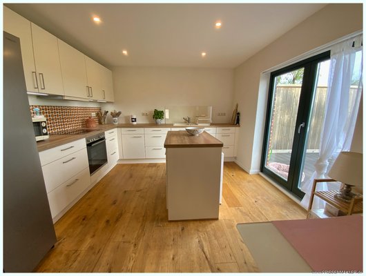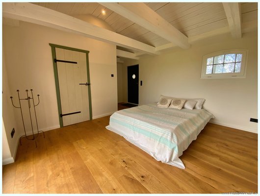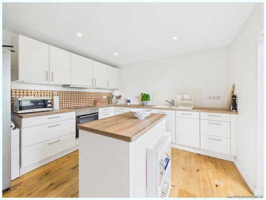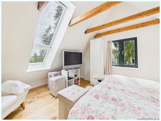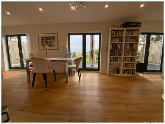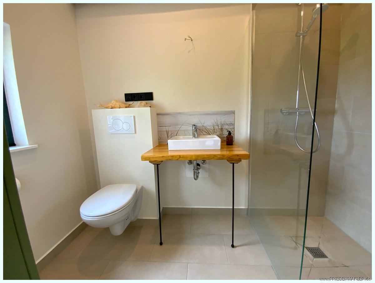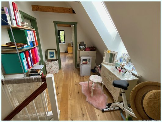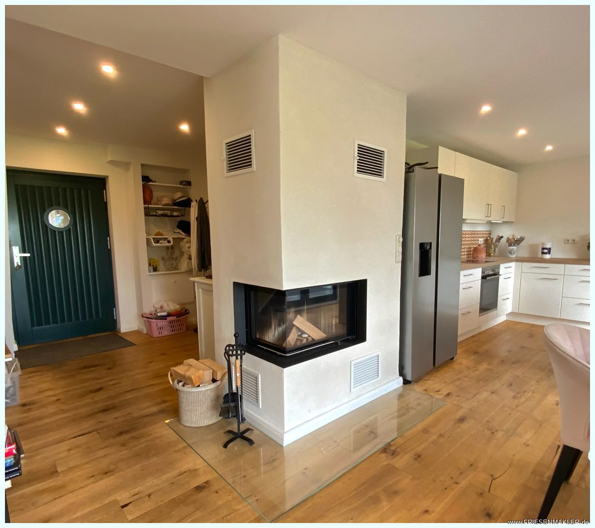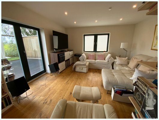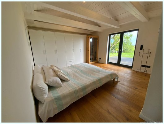 Das ursprünglich 1954 massiv errichtete Siedlungshaus wurde 2022/23 kernsaniert und hochwertig geschmackvoll umgestaltet. Dabei wurde Wert gelegt auf die Verwendung ökologisch unbedenklicher Baustoffe wie zB. Lehmbauplatten/ Lehmputz, Kasein Farbe und Isolierung mit Hanf. Alle Wohnräume sind mit schönem Echtholzparkett ausgelegt. Die Räume sind lichtdurchflutet dank bodentiefer Fenster und großzügiger spezieller Dachflächenfenster im Reetdach. Ein absolutes Highlight ist die sonnige Südterrasse über die gesamte Hausbreite mit dem weiten Blick ins Land. Gleiches gilt für die separate Terrasse des Gästebereichs. Dank eigener Haustür bietet sich der Gästebereich auch an als Büro/ Homeoffice, Atelier o.ä.