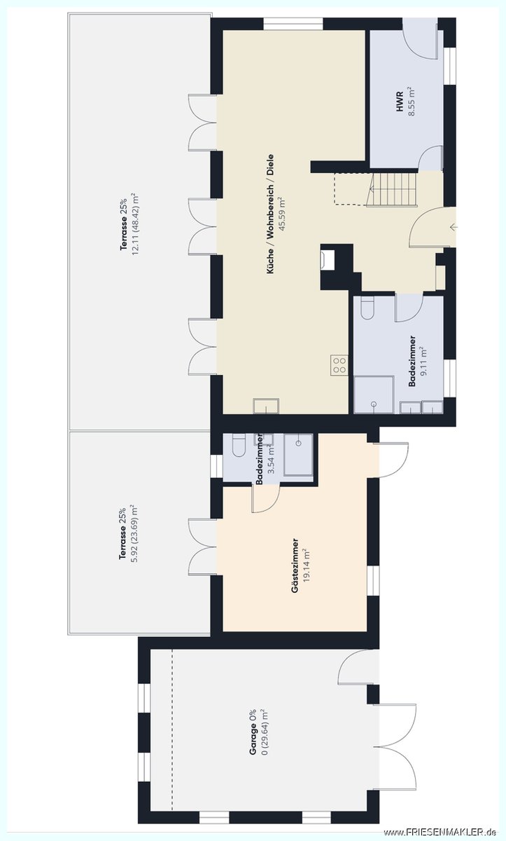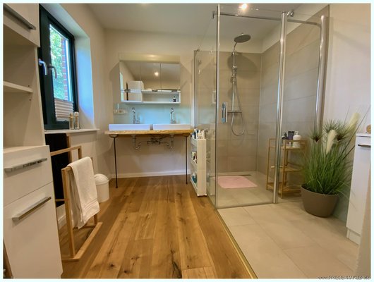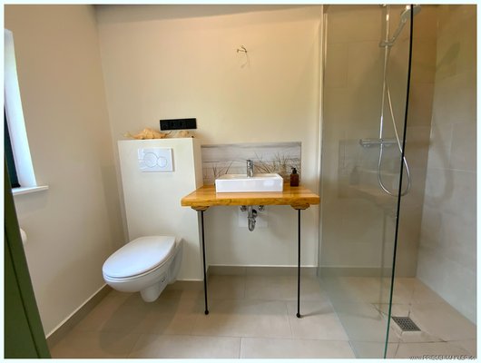 offener Flur mit Treppenaufgang und Durchgang in den großzügigen Wohn-küchen- Essbereich mit Terrassenausgängen, großes barrierefreies Duschbad, HWR mit Anschlüssen und Heiztechnik sowie separater Nebeneingangstür, Gästebereich mit separatem Zugang, barrierefreiem Duschbad und großer eigener geschützter Terrasse