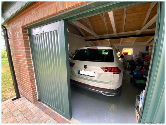 große Garage mit Abstellfläche, 2 zusätzliche Kfz-Stellplätze davor sowie ein ca. 50qm Bereich für 2 weitere Parkplätze.