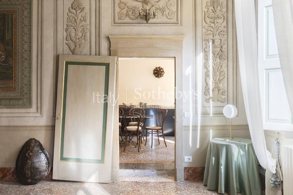 Die Immobilie öffnet sich zu einem großzügigen, 60 m² großen zentralen Salon, der an Decke und Wänden mit neoklassizistischen Fresken aus dem frühen 19. Jahrhundert verziert ist, die dem Maler Filippo Pedrini zugeschrieben werden. Der perfekt erhaltene venezianische Terrazzo-Boden und die dekorative Ausstattung von großer Wirkung verleihen dem Raum zeitlose Eleganz.