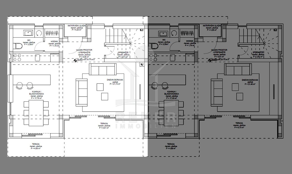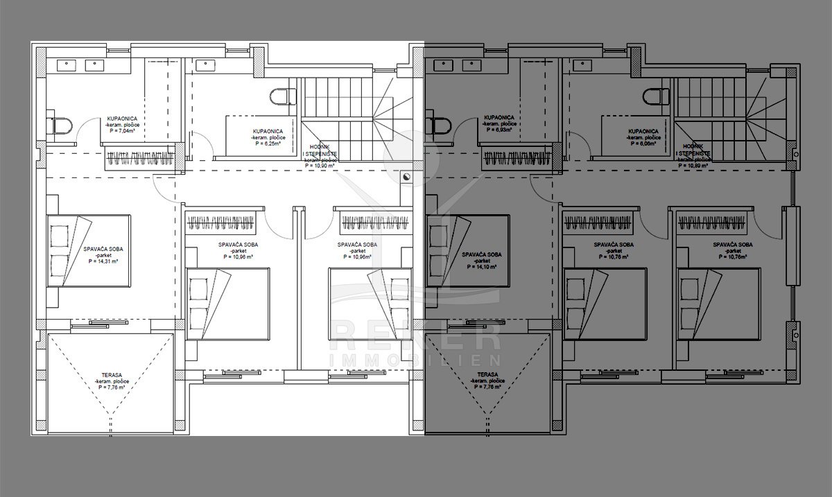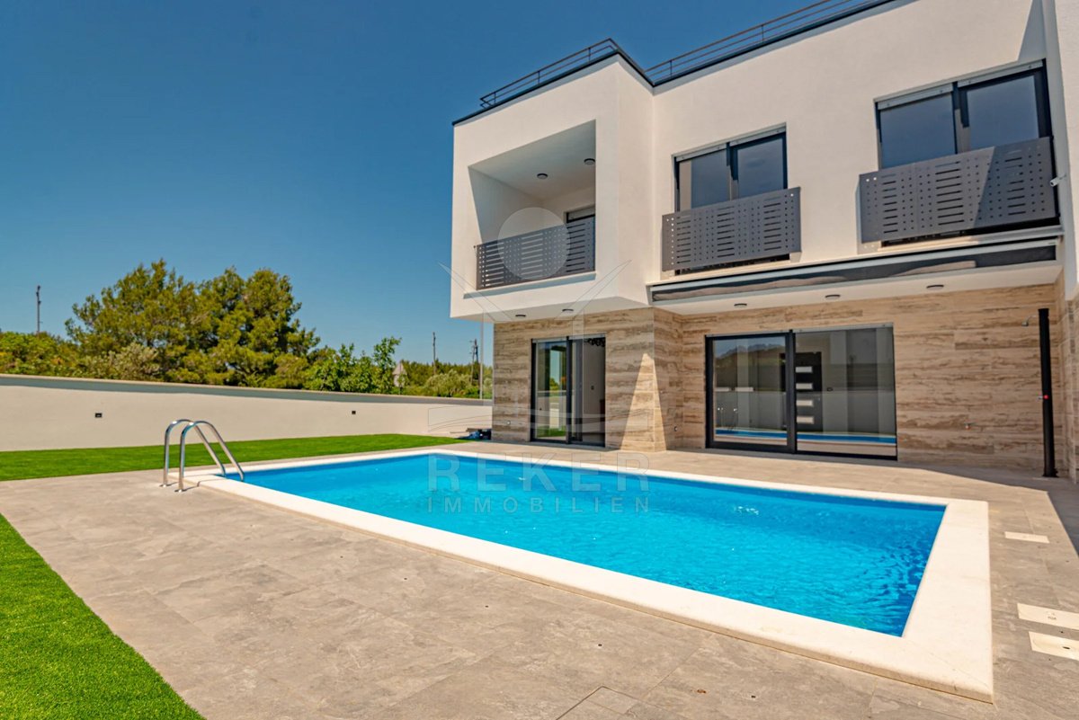 Am Rand von Vodice entsteht in sonniger Südwestlage eine moderne Doppelhaushälfte mit Meerblick. Das Zentrum erreichen Sie nach rund 1.300 Metern, den Strand nach etwa 1.200 Metern. Nah genug für spontane Ausflüge, weit genug für Ruhe und