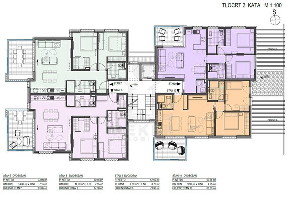 Klare, moderne Architektur: insgesamt entstehen zwölf Wohnungen, verteilt auf vier Etagen – Erdgeschoss bis dritte Stock. Ein Aufzug sorgt für barrierearmen Zugang auf allen Ebenen. Draußen erwartet Sie ein gemeinschaftlicher Pool – ideal für entspannte Stunden unter freiem Himmel. Für jedes Apartment ist ein Stellplatz vorgesehen. Kurz gesagt: alles da, was das Wohnen angenehm macht.