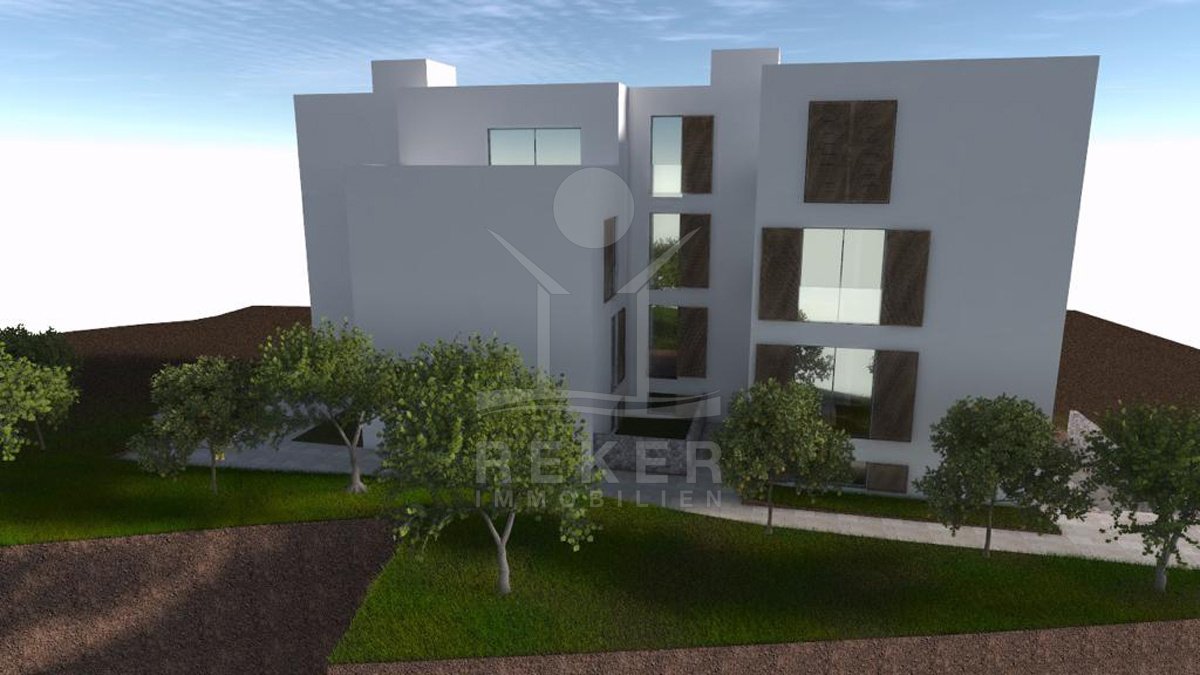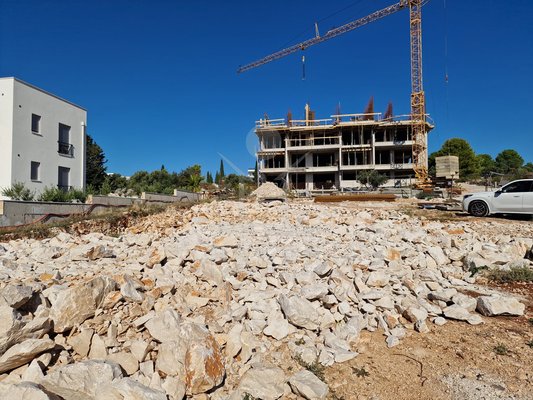 Auf der Insel Čiovo, nicht weit von Trogir, steht dieses moderne Wohnhaus, umgeben von neuen Wohnhäusern. Eine typische dalmatinische Mischung: grüne Landschaft, Meernähe und alles Wichtige für den Alltag gleich um die Ecke. Die Hanglage bringt zwei