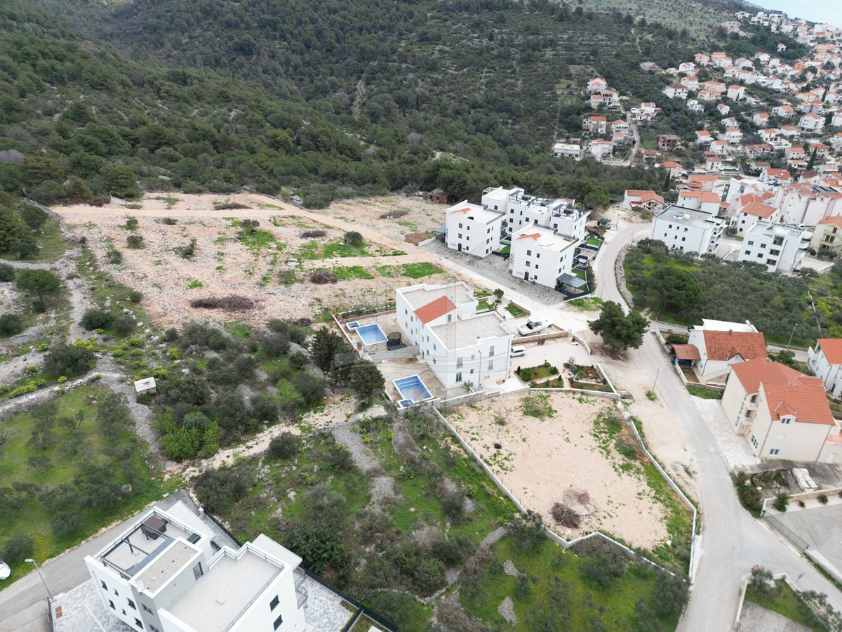 Auf der Insel Čiovo, nicht weit von Trogir, steht dieses moderne Wohnhaus, umgeben von neuen Wohnhäusern. Eine typische dalmatinische Mischung: grüne Landschaft, Meernähe und alles Wichtige für den Alltag gleich um die Ecke. Die Hanglage bringt zwei