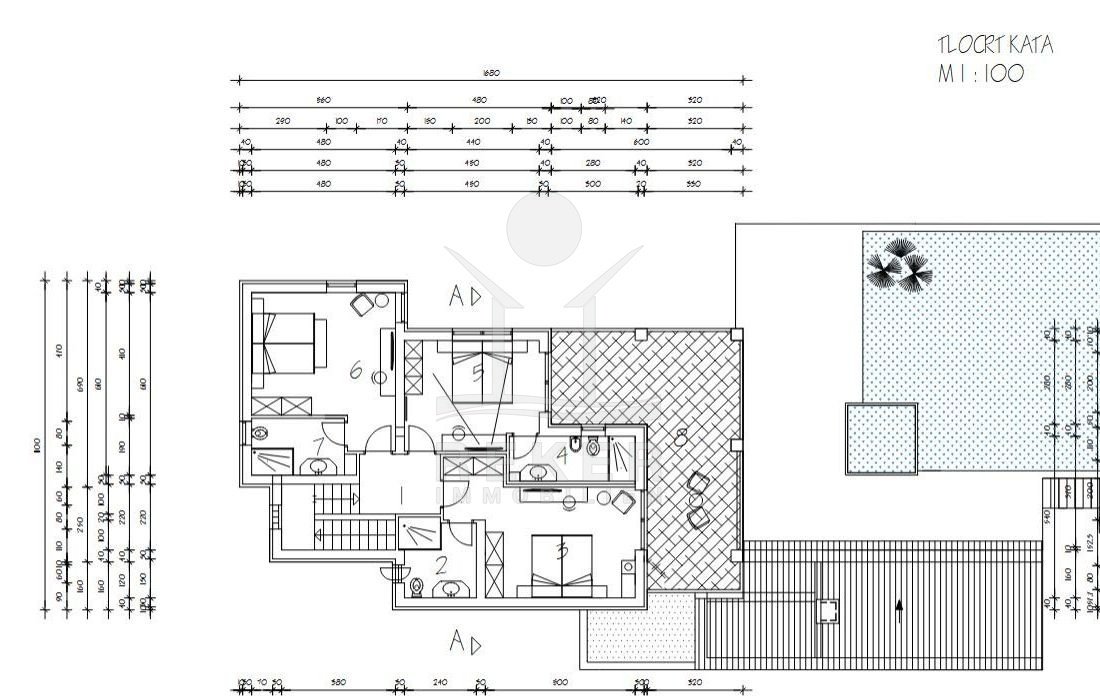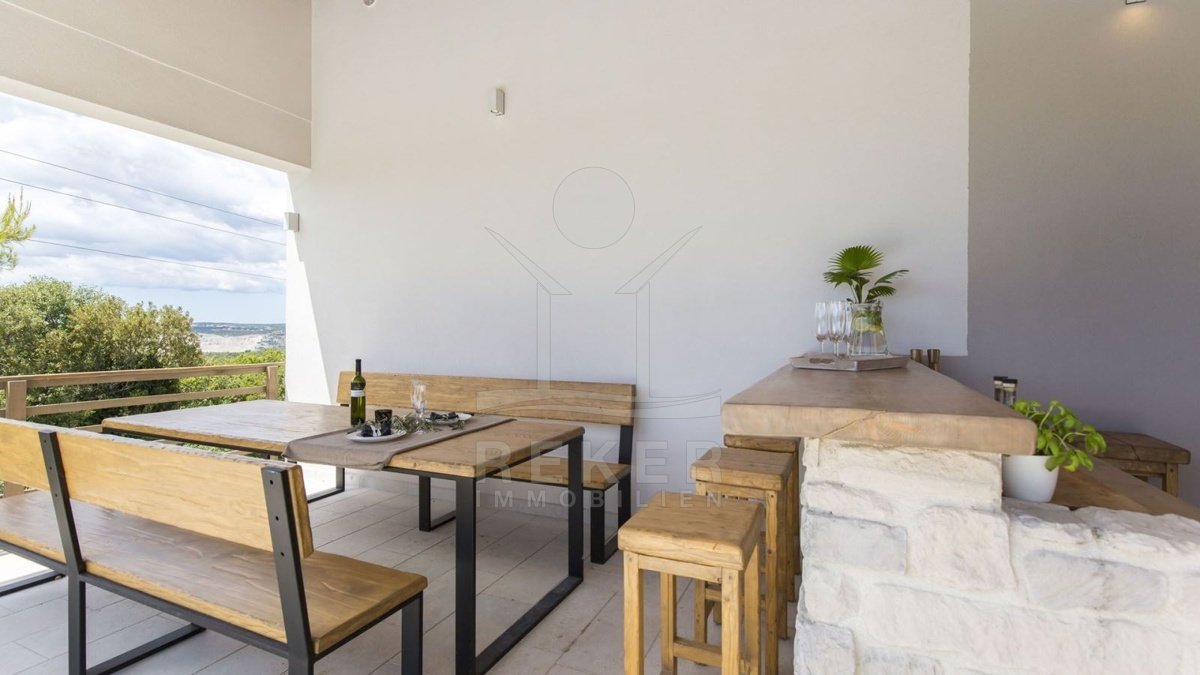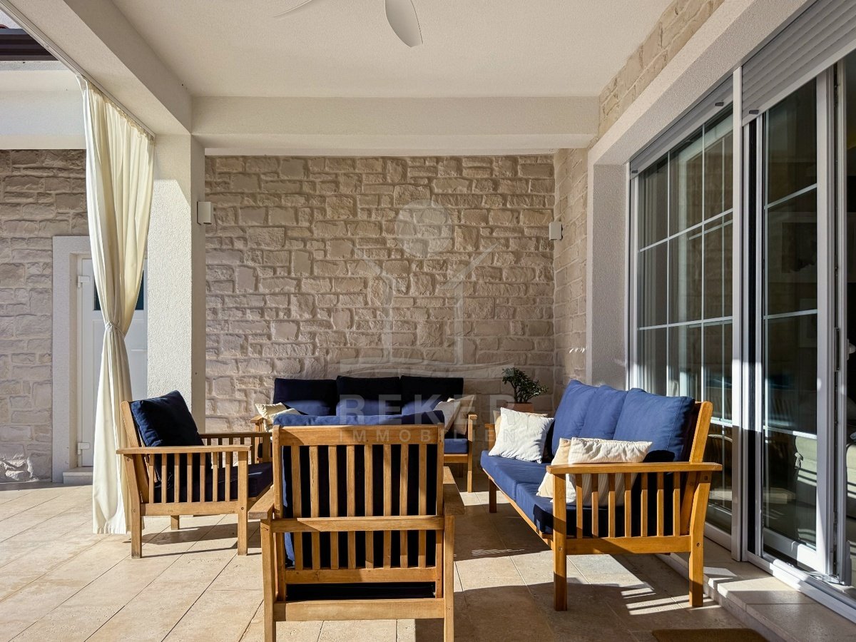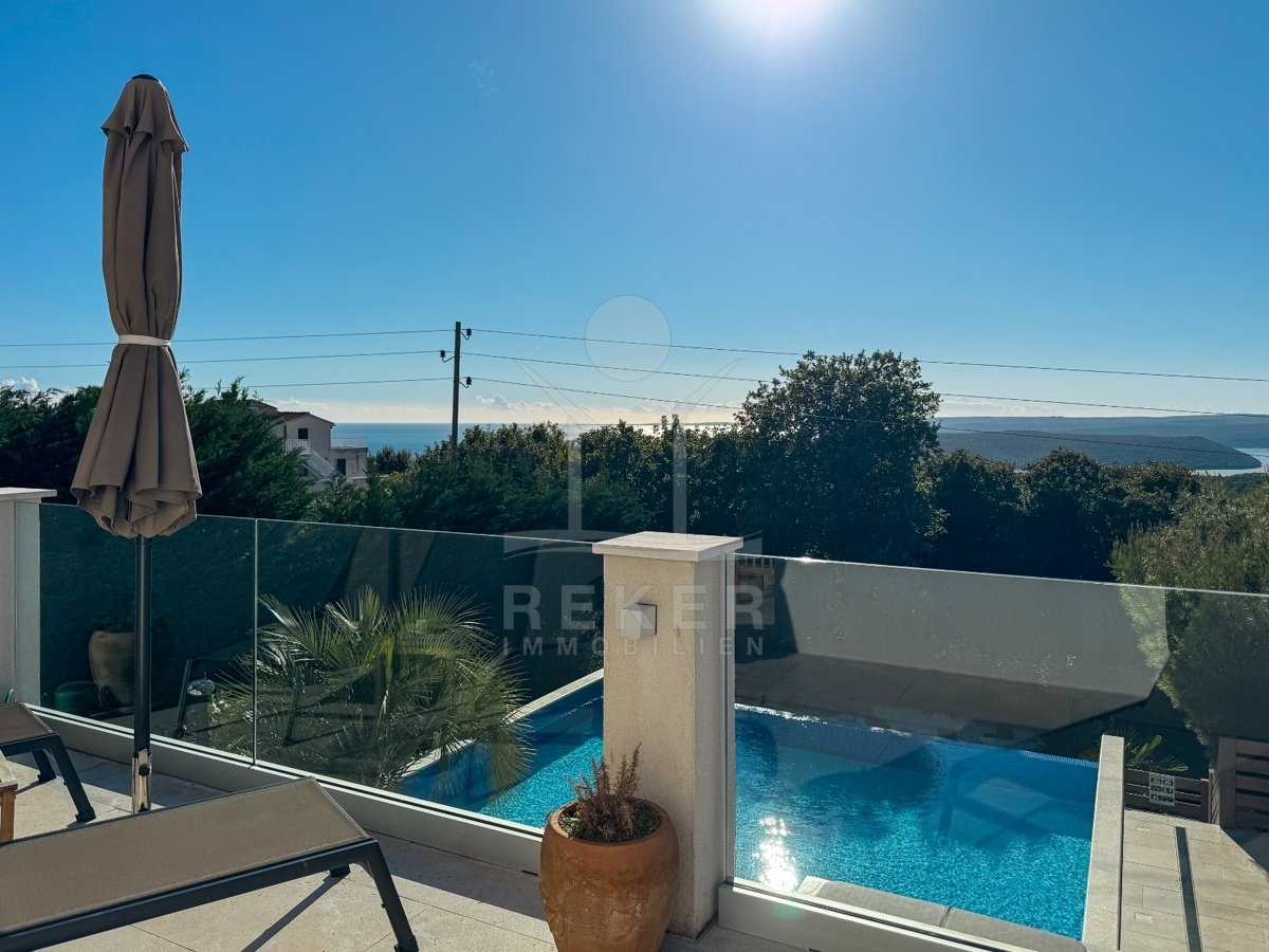 Nahe Labin, nur 1,6 km vom Meer entfernt, erwartet Sie eine moderne Villa, die Komfort und mediterrane Atmosphäre verbindet. Das Haus befindet sich in ruhiger Umgebung mit gepflegten Einfamilienhäusern, Olivenbäumen und Blick auf die Kvarner-Bucht.