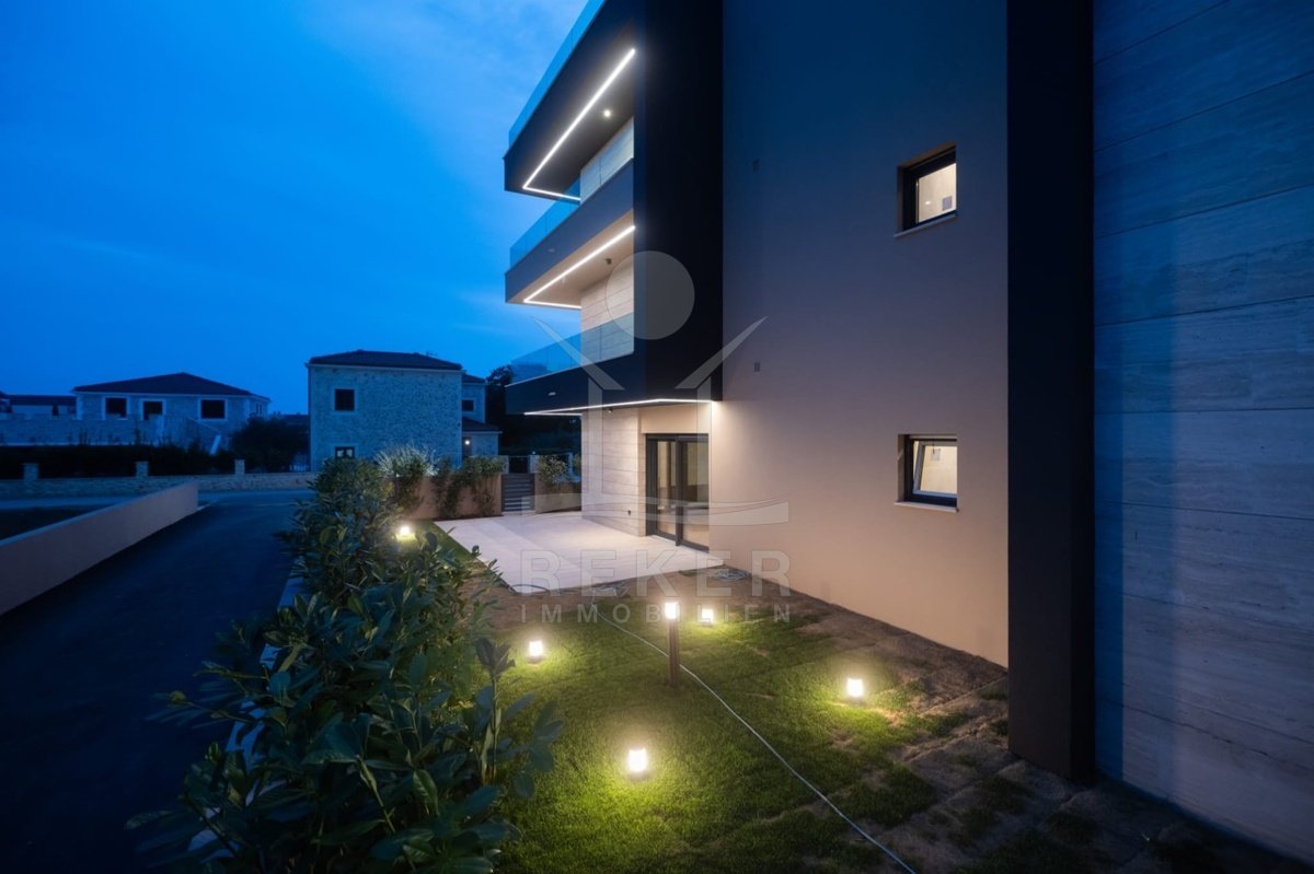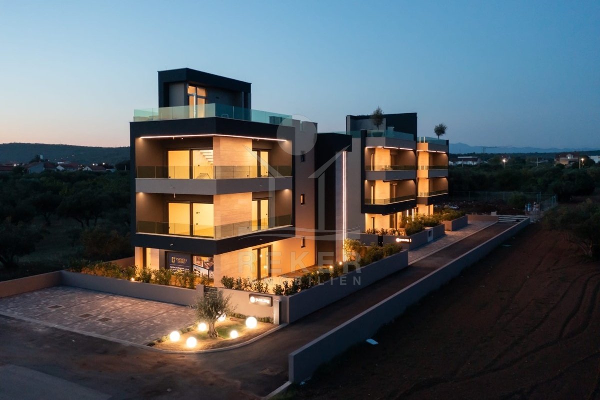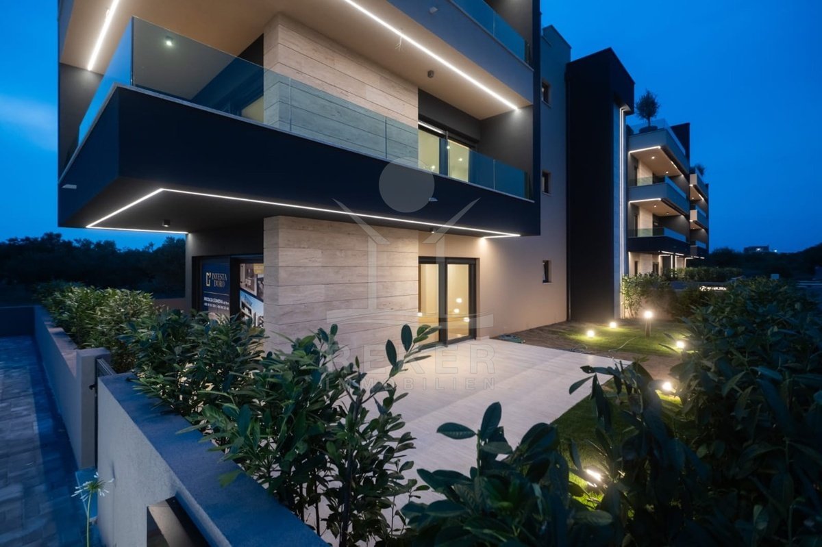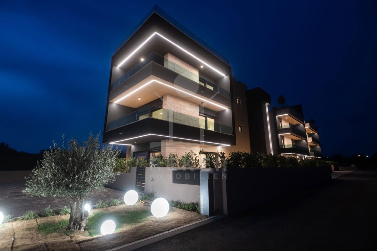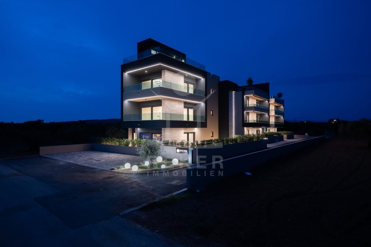 Im ruhigen, grünen Teil von Sukošan entsteht ein exklusives Wohnprojekt mit nur drei Wohnungen. Jede umfasst eine komplette Etage: Erdgeschoss, erstes und zweites Obergeschoss, dazu eine private Dachterrasse. Die Umgebung zeigt mediterranen