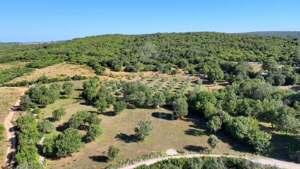 Südlich von Rovinj, nur 2,4 km vom Meer entfernt, erstreckt sich ein großzügiges Grundstück mit rund 19.500 m² Fläche. Die Umgebung ist ruhig, ländlich und von sanften Hügeln geprägt. Von hier aus reicht der Blick über die grüne Landschaft bis hin zum Meer. Etwa 60 Olivenbäume wachsen auf dem Gelände, umgeben von Wiesen und naturbelassenem Buschland. Zwei Schotterstraßen führen entlang der Nord- und Südseite und ermöglichen bequemen Zugang. Wasser ist angeschlossen, Strom verläuft an der Grundstücksgrenze.