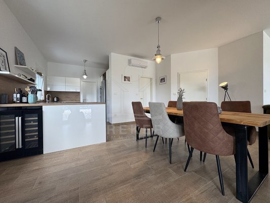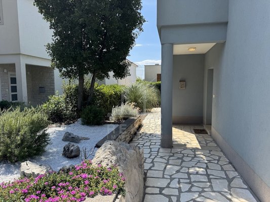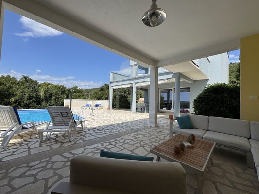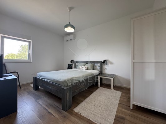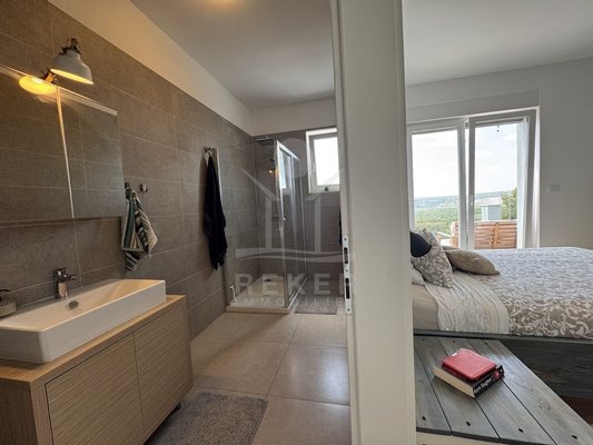 Im idyllischen Ort Viškovići in der Gemeinde Raša steht diese moderne Villa mit offenem Meerblick. Ruhig eingebettet in grüne Natur und nur rund 2 Kilometer von der Bucht Tunarica entfernt, verbindet sie Ruhe, Privatsphäre und Nähe zum Meer. Die Umgebung ist geprägt von Wäldern, mediterraner Vegetation und klarer Luft. Durch die Hanglage genießen Sie Sonne und Aussicht bis zum Horizont. Die Zufahrt ist bequem, das Umfeld gepflegt und nahezu frei von Verkehr.
