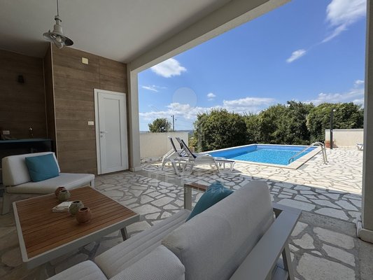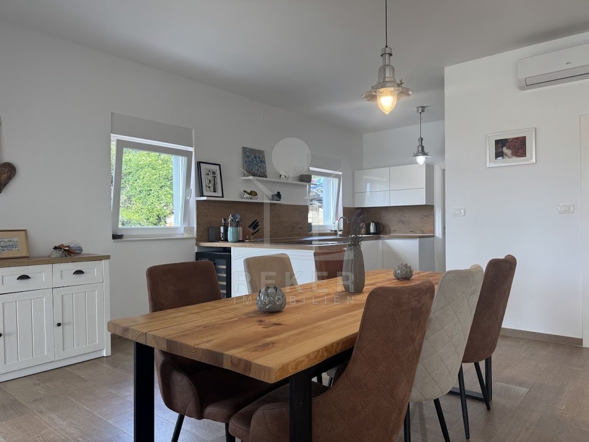 Im idyllischen Ort Viškovići in der Gemeinde Raša steht diese moderne Villa mit offenem Meerblick. Ruhig eingebettet in grüne Natur und nur rund 2 Kilometer von der Bucht Tunarica entfernt, verbindet sie Ruhe, Privatsphäre und Nähe zum Meer. Die
