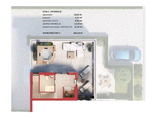 Der Außenbereich lädt zum Entspannen ein. Eine überdachte Terrasse öffnet sich zum gepflegten Garten mit einem 12,6 m² großen Pool, ein geschützter Platz für sonnige Tage. Die 48,95 m² große Dachterrasse ist nach Westen ausgerichtet und bietet Raum für einen Whirlpool und den schönsten Blick auf den Sonnenuntergang.