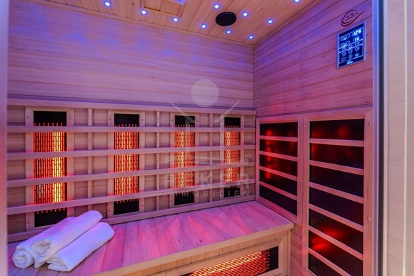 Der Garten wirkt gepflegt und mediterran. Eine überdachte Pergola, ein Grillplatz und eine große Liegewiese schaffen Raum für entspannte Stunden. Mittelpunkt des Außenbereichs ist der 9 × 6 Meter große Pool mit Elektrolyseanlage. Dazu kommen ein automatisches Bewässerungs- und Beleuchtungssystem, das die Pflege erleichtert. Eine angenehme Atmosphäre für den Abend.