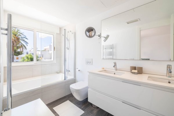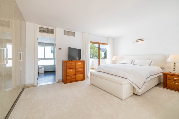 Im ersten Stock befinden sich insgesamt drei Schlafzimmer und zwei Bäder, die sich wie folgt verteilen: Ein Schlafzimmer mit Kingsize-Bett, eigenem Bad, begehbarem Kleiderschrank und einer privaten Terrasse mit Blick auf den Pool. Es gibt auch ein Schlafzimmer mit Doppelbett und ein Zweibettzimmer, die sich ein Badezimmer teilen.