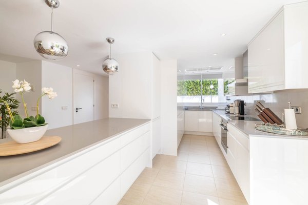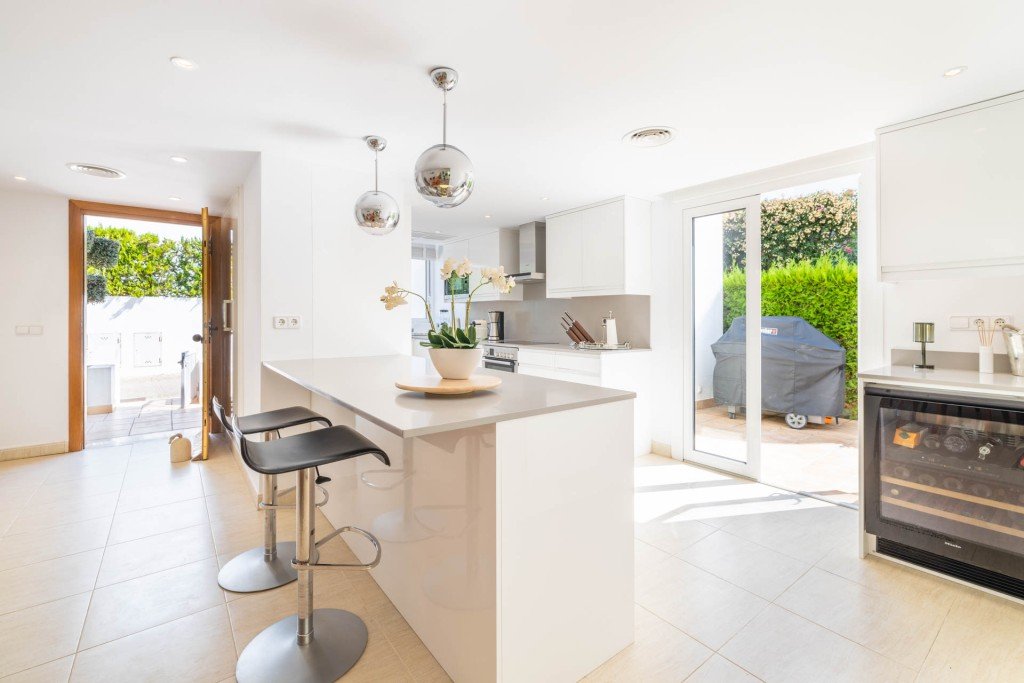 Auf der anderen Seite des Erdgeschosses befinden sich ein Essbereich und eine moderne Einbauküche mit Frühstücksbar und Weinkühlschrank, ebenfalls mit Zugang zu zwei weiteren Terrassen, darunter eine mit einem großen Webber-Grill und elektrischer Markise. Auf dieser Ebene befinden sich auch ein Gästebad und ein Wasch- und Hauswirtschaftsraum, der über den Patio erreicht werden kann.