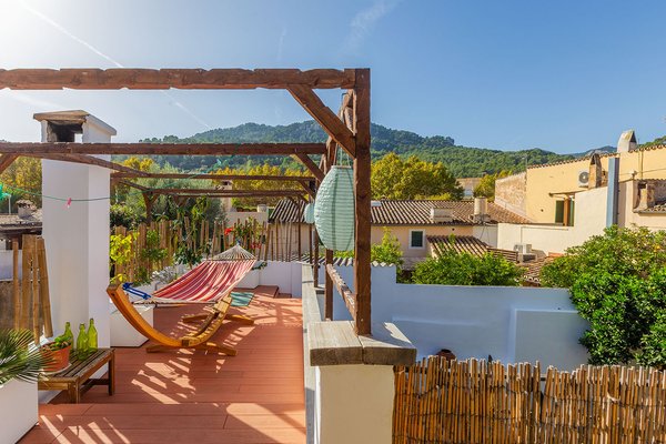 In der oberen Etage befinden sich zwei Schlafzimmer, wobei das großzügige Hauptschlafzimmer mit einer Lounge Zugang zu einer gemütlichen Terrasse hat. Diese ist zudem direkt vom Patio aus erreichbar und bildet eine weitere Oase der Ruhe mit Blick auf das Tramuntana-Gebirge.