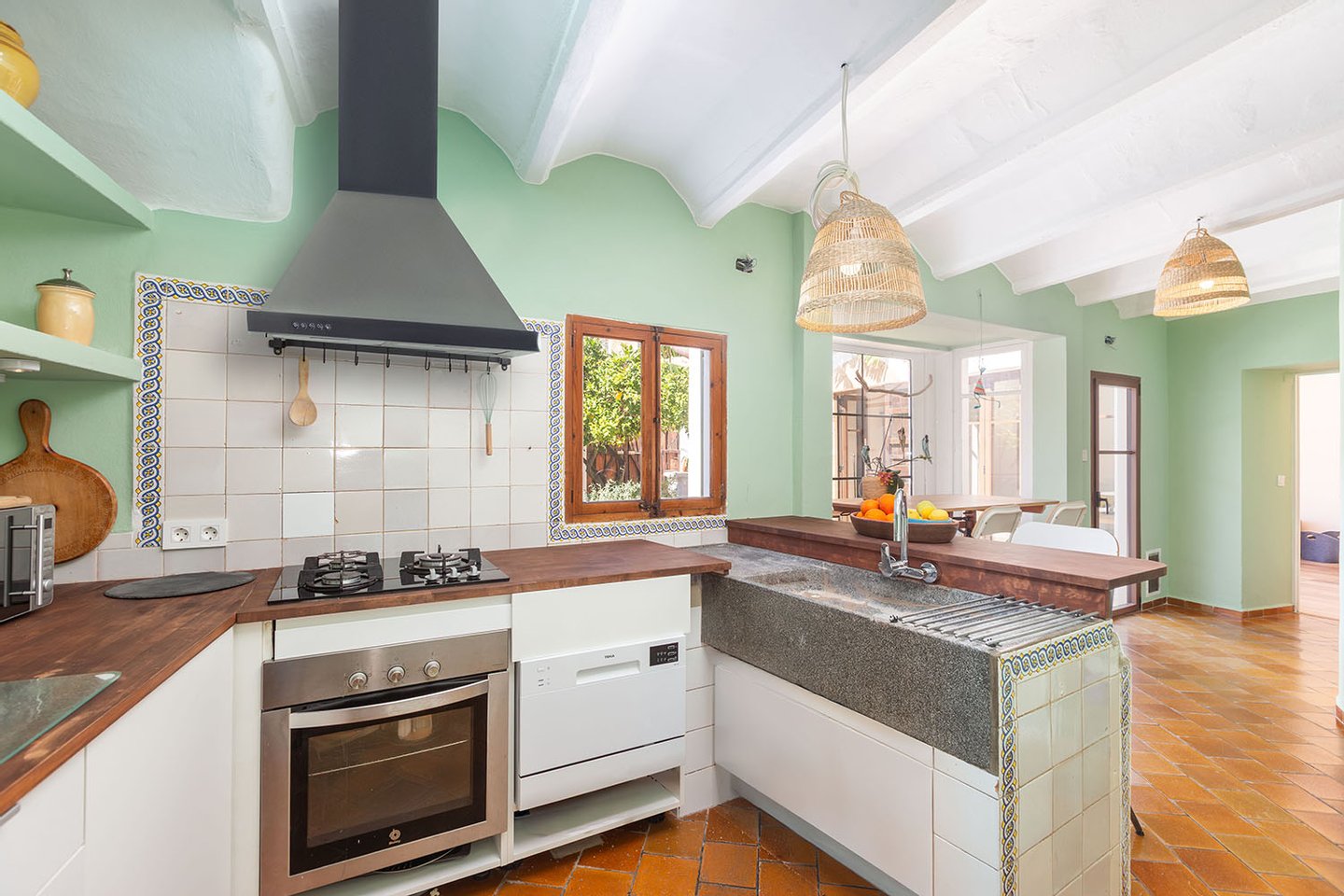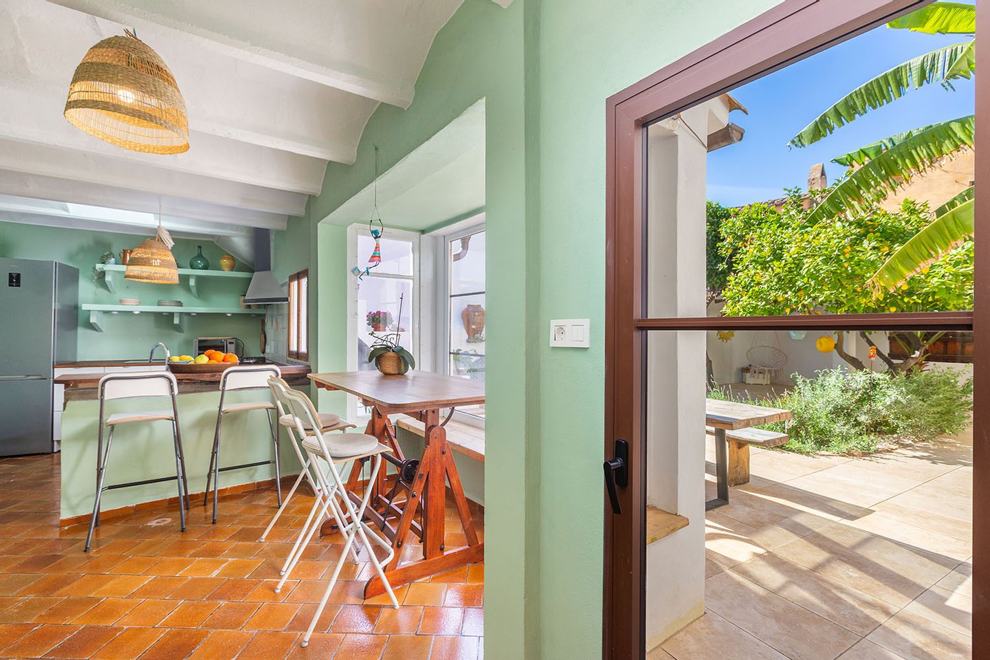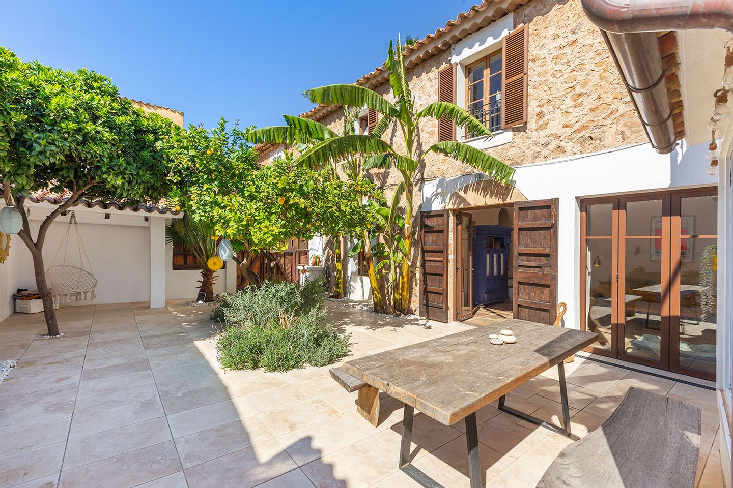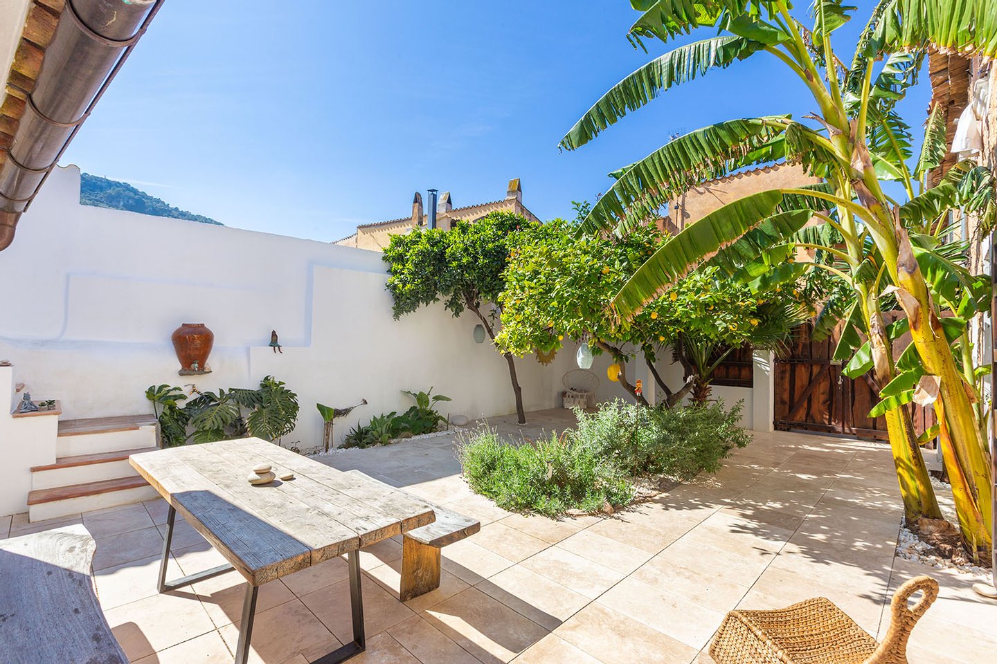 Der Hauptwohnbereich befindet sich im Erdgeschoss und öffnet sich direkt zum Patio, der mit seiner üppigen Bepflanzung ein echtes Highlight darstellt. Dieser idyllische Innenhof ist vollkommen uneinsehbar und mit Zitronen-, Orangen- und Bananenbäumen mediterran bepflanzt – ein privates Paradies, das zum Entspannen, Essen und Genießen einlädt.