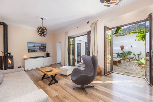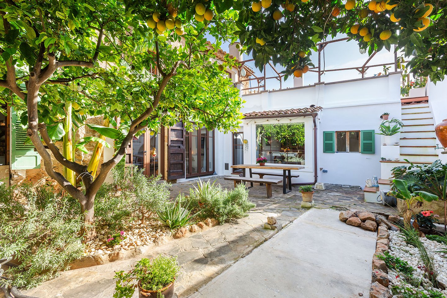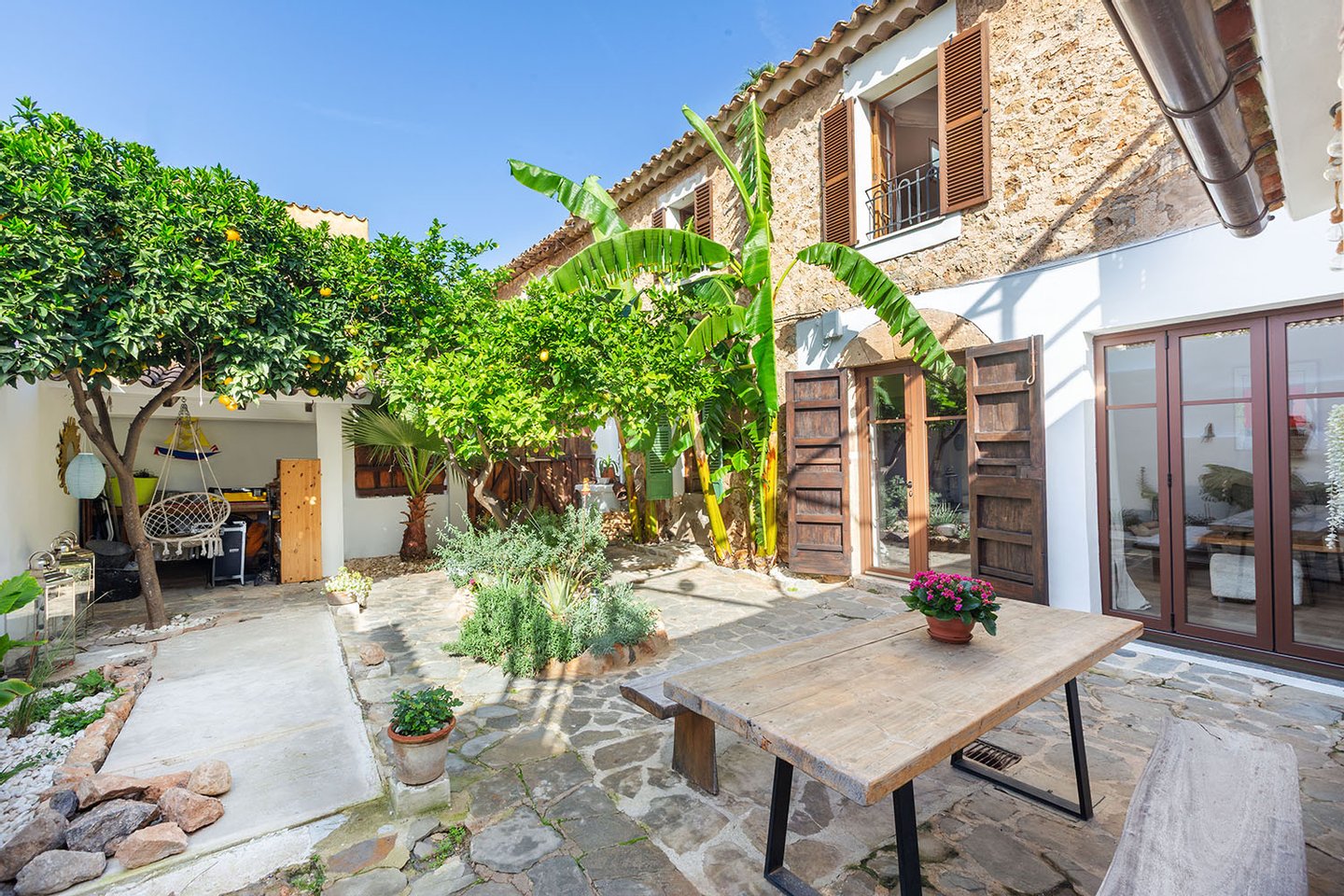 Der Hauptwohnbereich befindet sich im Erdgeschoss und öffnet sich direkt zum Patio, der mit seiner üppigen Bepflanzung ein echtes Highlight darstellt. Dieser idyllische Innenhof ist vollkommen uneinsehbar und mit Zitronen-, Orangen- und Bananenbäumen mediterran bepflanzt – ein privates Paradies, das zum Entspannen, Essen und Genießen einlädt.
