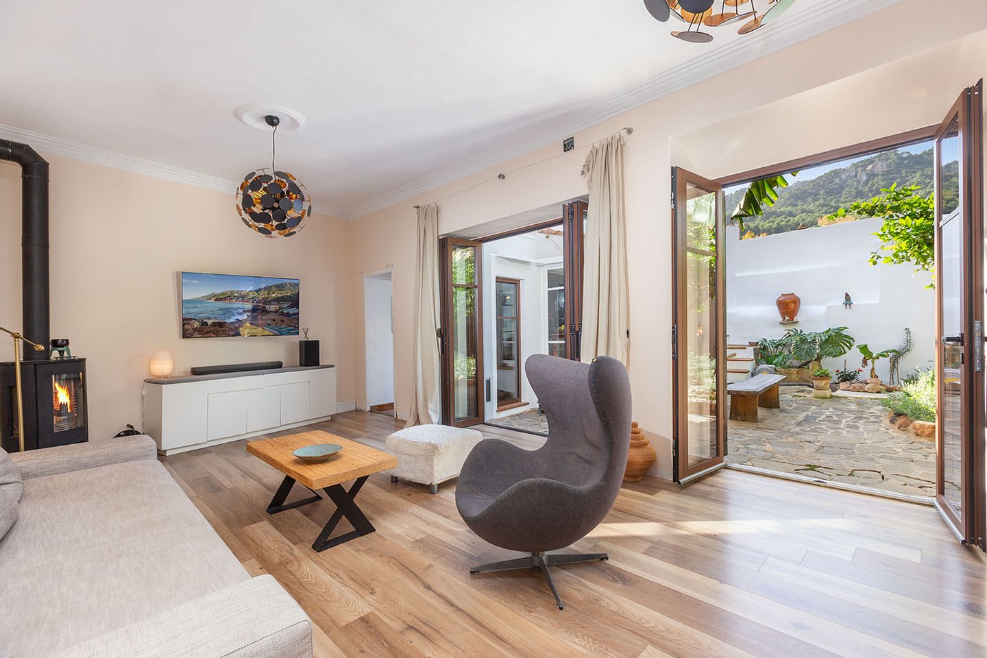 Originale Sichtbalken, hochwertige Parkettfußböden, ein rustikaler Holzofen sowie neue Doppelfenstertüren im mallorquinischen Stil und ausgesuchte Details verleihen dem Haus eine behagliche Atmosphäre. Helle Erdtöne und die Südwestausrichtung sorgen für ein sonnendurchflutetes warmes Wohnambiente.