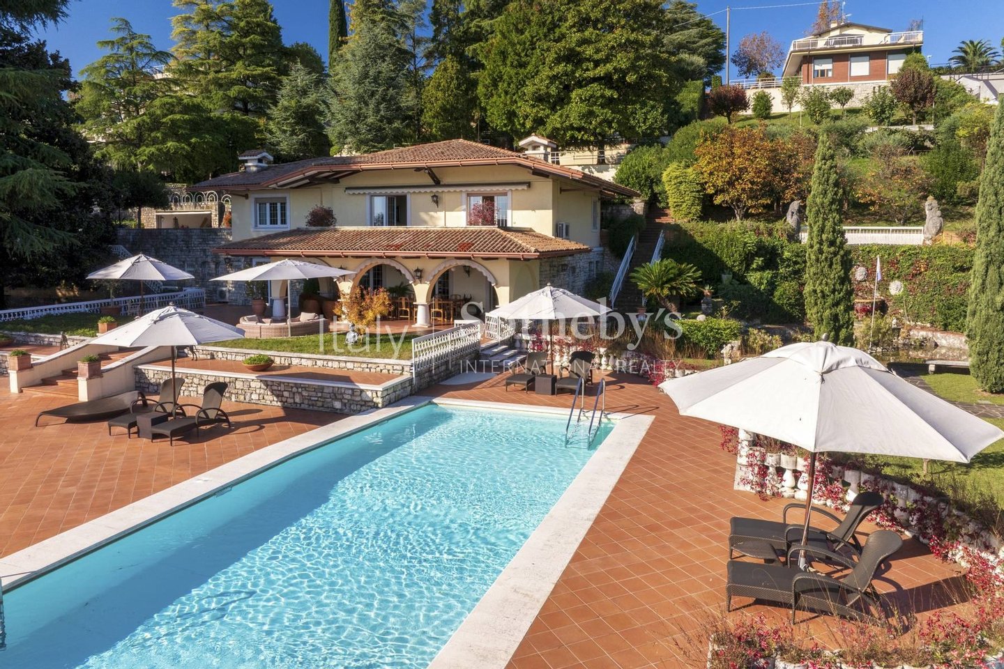 Im Außenbereich führt eine große Veranda zur 200 m² großen Sonnenterrasse mit einem beeindruckenden Infinity-Pool, der scheinbar mit dem See verschmilzt und ein ununterbrochenes Spiel aus Licht und Reflexen erzeugt. Die Dependance besteht aus drei Schlafzimmern und drei Bädern sowie einem kleinen Wohn- und Entspannungsbereich, ideal, um Gäste in komfortabler und privater Atmosphäre zu empfangen. Im Untergeschoss befindet sich eine geräumige Taverne mit Kamin sowie ein Weinkeller mit Tonnengewölbe. Weitere großzügige Räume im Halbuntergeschoss bieten Potenzial für einen Wellnessbereich mit Spa und/oder Freizeiträume.