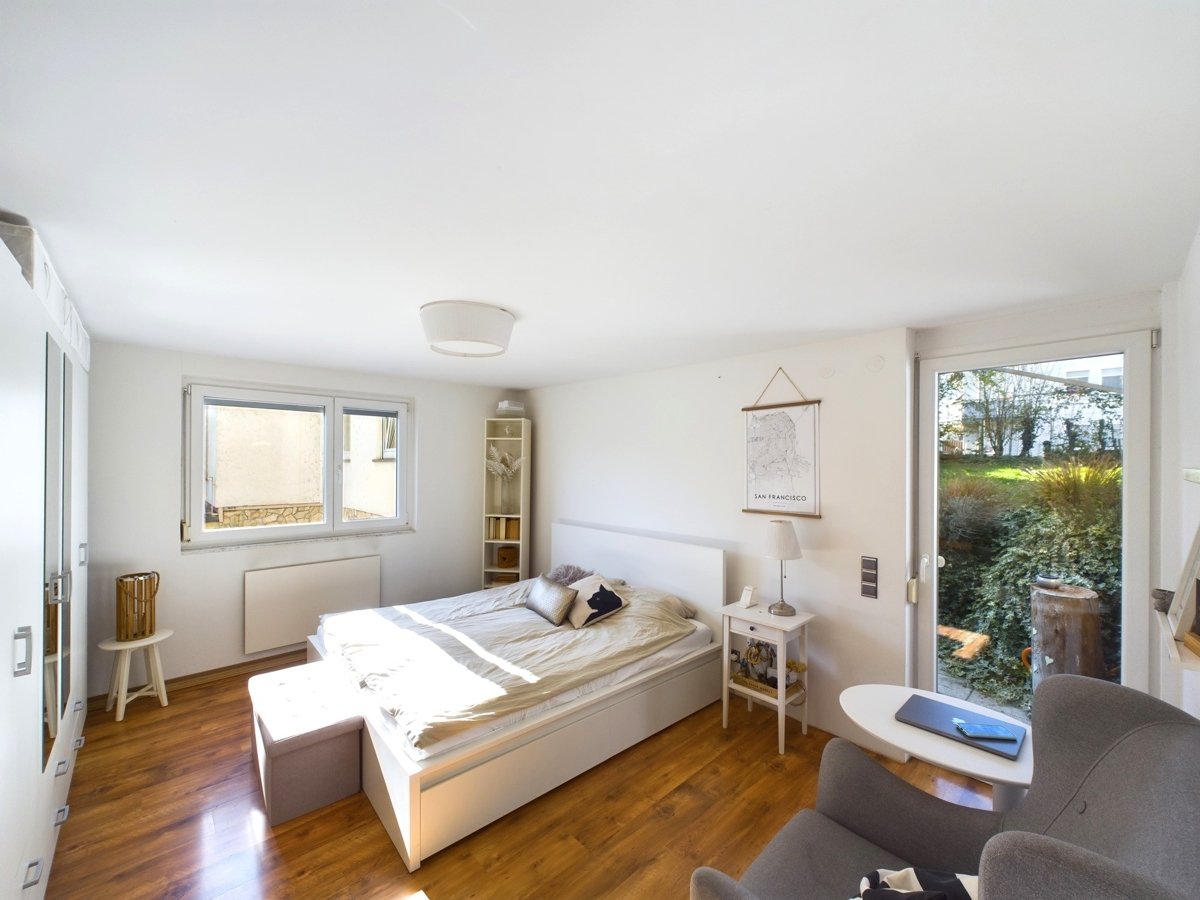 Das Schlafzimmer bietet Rückzugsmöglichkeiten und direkten Zugang zur Terrasse. Es schafft durch den großzügigen Schnitt Raum für individuelle Gestaltung.