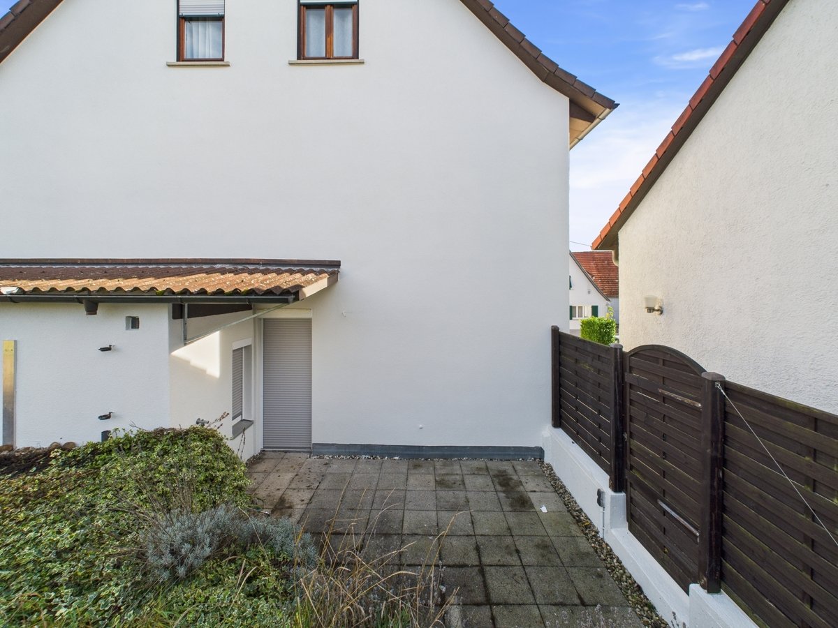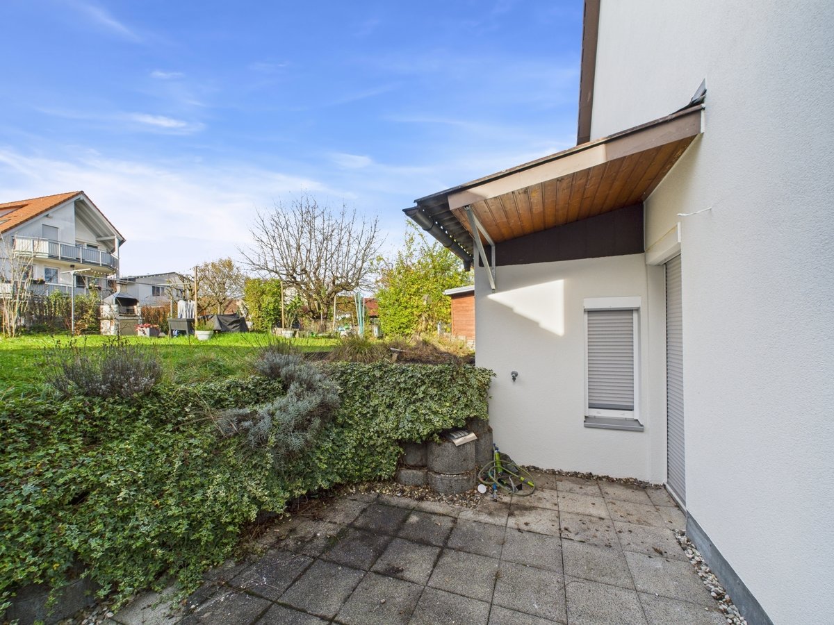 Die Terrasse und der ruhige Gartenanteil laden zum Entspannen im Freien ein.